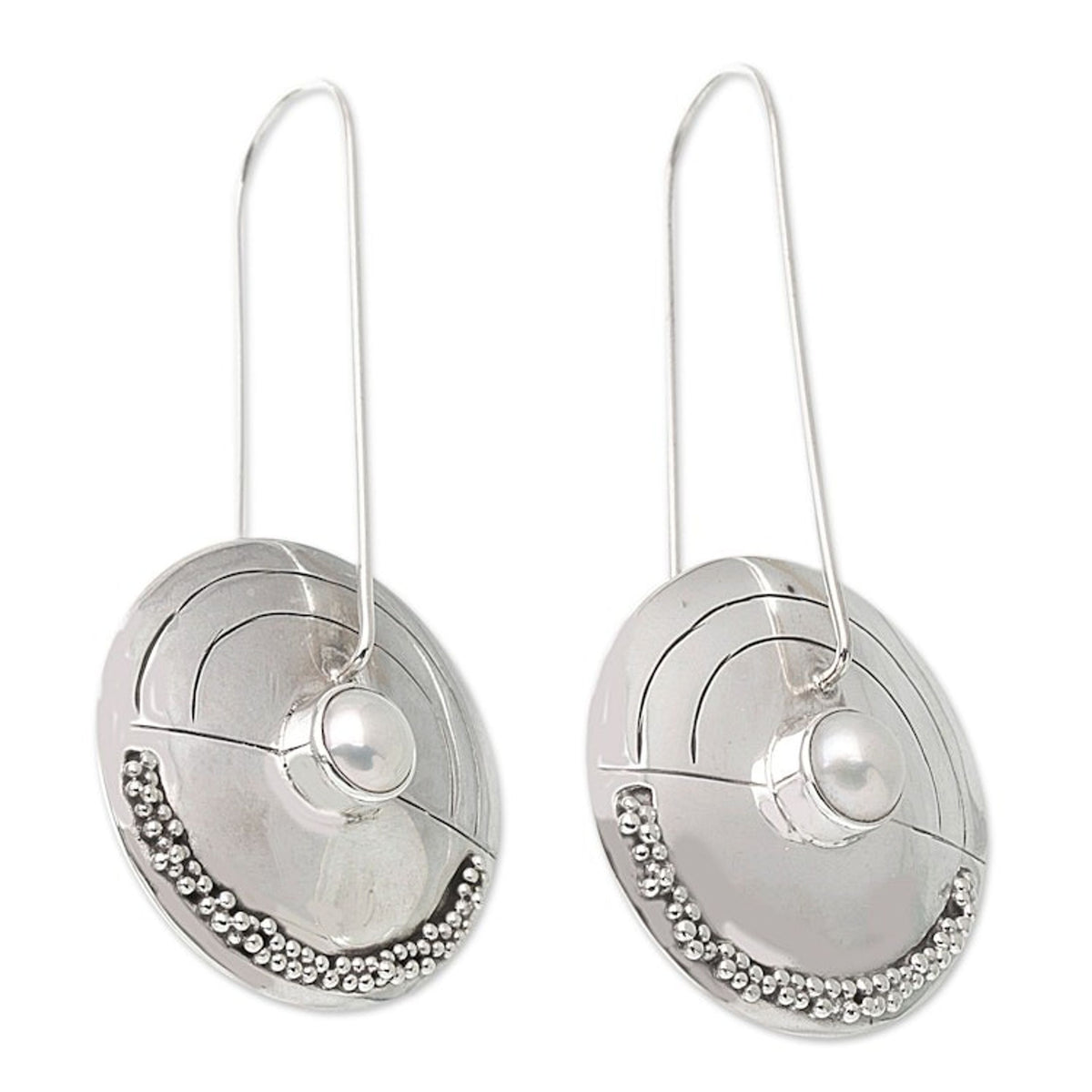 Handcrafted in Indonesia from sterling silver and freshwater pearls, these hook earrings have a high polish finish. They measure 2 inches long by 1.1 inches wide.