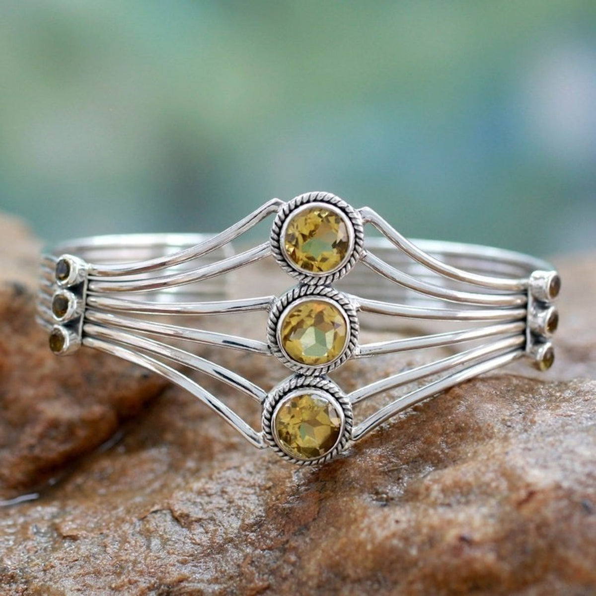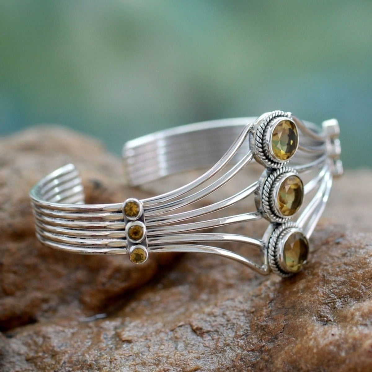 Handcrafted in India from sterling silver and citrine, this cuff bracelet has a high polish finish. It measures 6 inches long (end to end) by 1.2 inches wide.