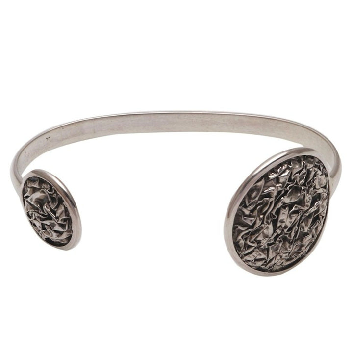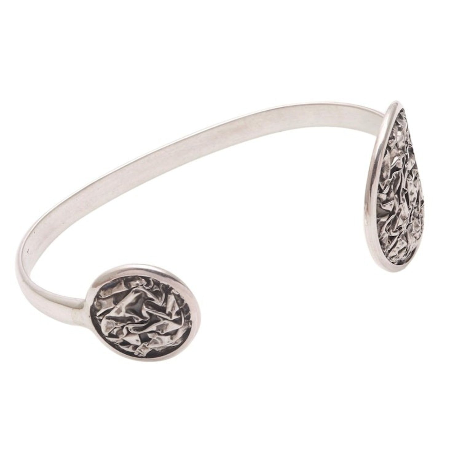 This Modern Sterling Silver Cuff Bracelet Crafted in Bali 'Kintamani Contour' is a gorgeous and modern accessory by Balinese artisan Anya. The sterling silver cuff bracelet features intricate contours, as if crinkled within two framed panels at the bracelet's ends. A combination of finishes accentuates the folds. The piece reflects Anya's ability to blend simplicity and traditional Balinese designs while mentoring a team of silversmiths.