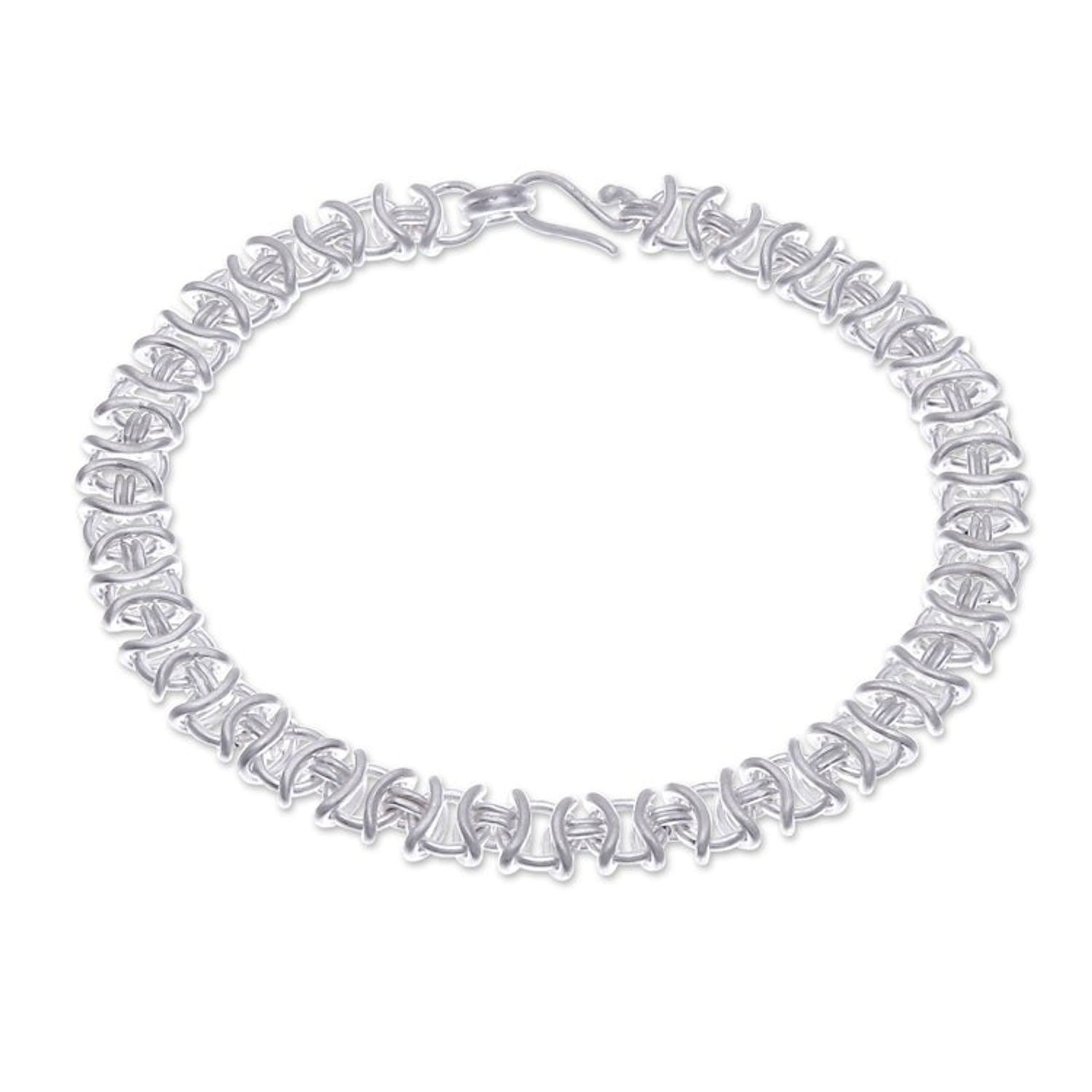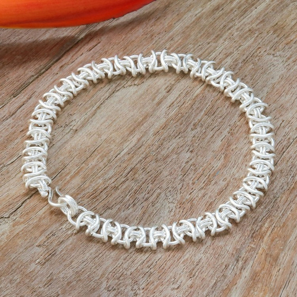 Handcrafted in Thailand from .925 sterling silver, this Byzantine chain bracelet has a brushed-satin finish and an S-hook or hook clasp. It measures 7.8 inches long with a 0.2-inch width.