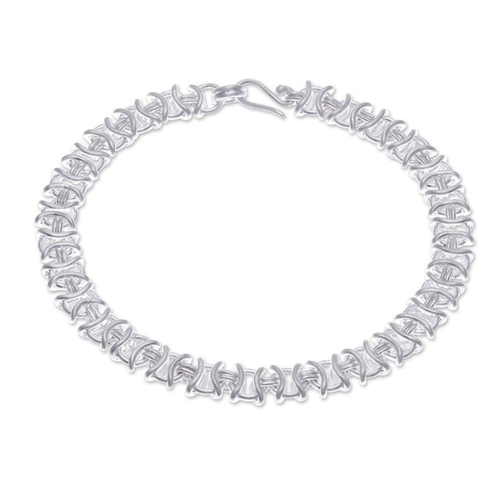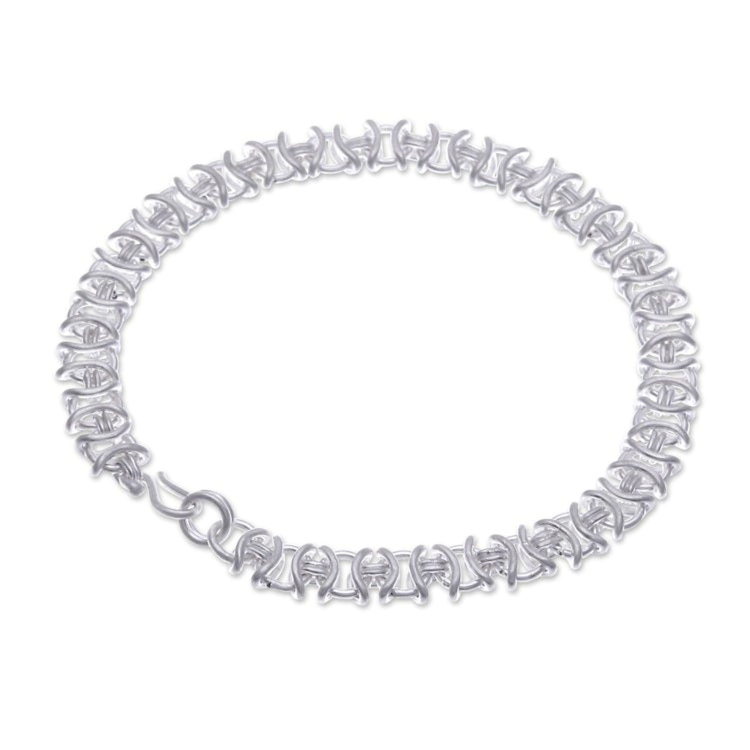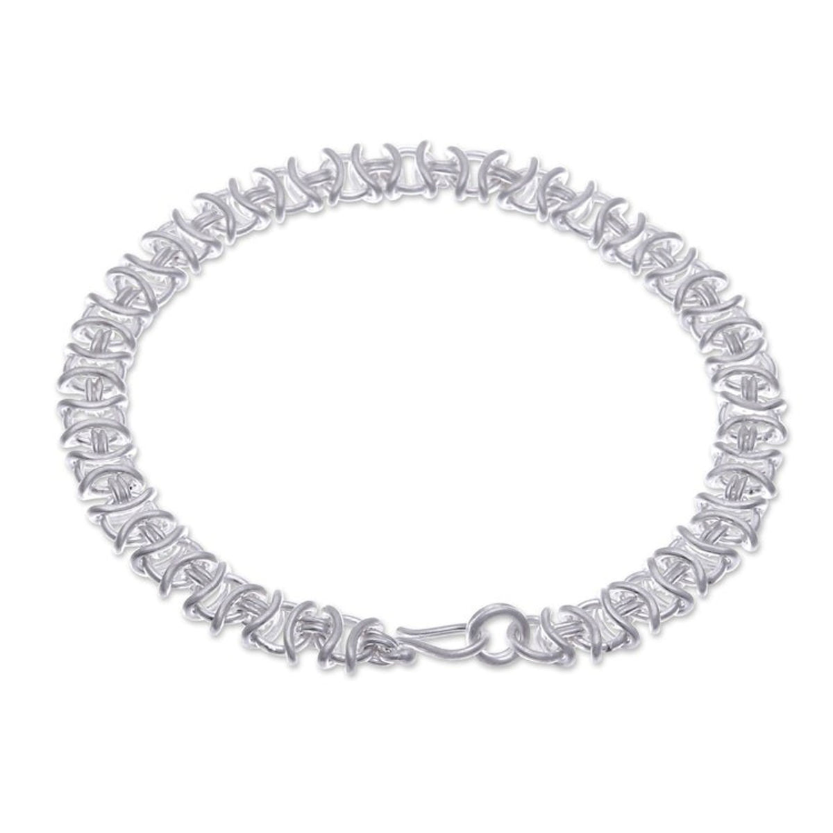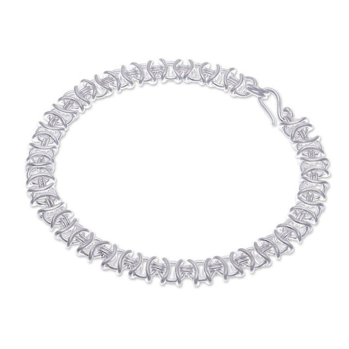 This Modern Sterling Silver Link Bracelet in Brushed-Satin Finish 'Divergent Ties' is a smart and modern accessory by Thai artisan Sarote Lochotinunt. The link bracelet is composed of a series of windy shapes strongly joined together and has a brushed-satin finish. It finishes with a hook clasp for a handy fit. The piece reflects Sarote's technical expertise and his ability to create jewelry with distinct character, as he brings together technical expertise and a love of natural materials.
