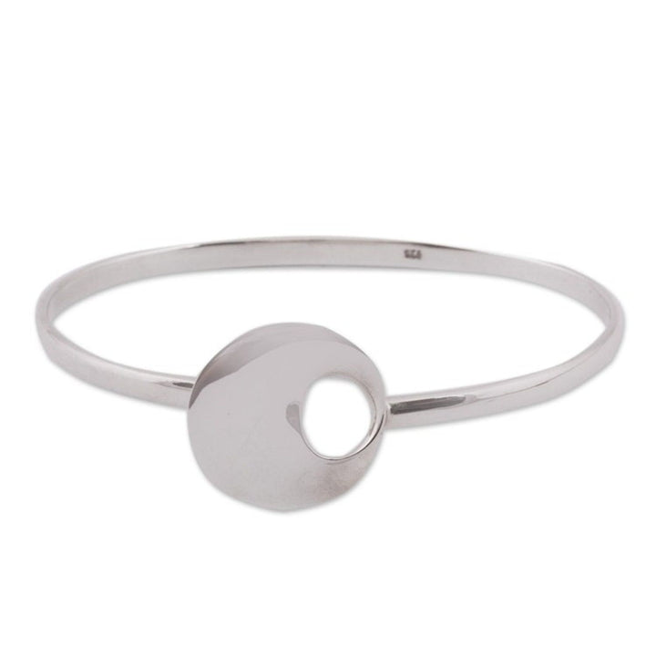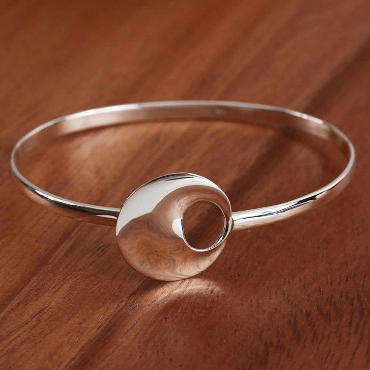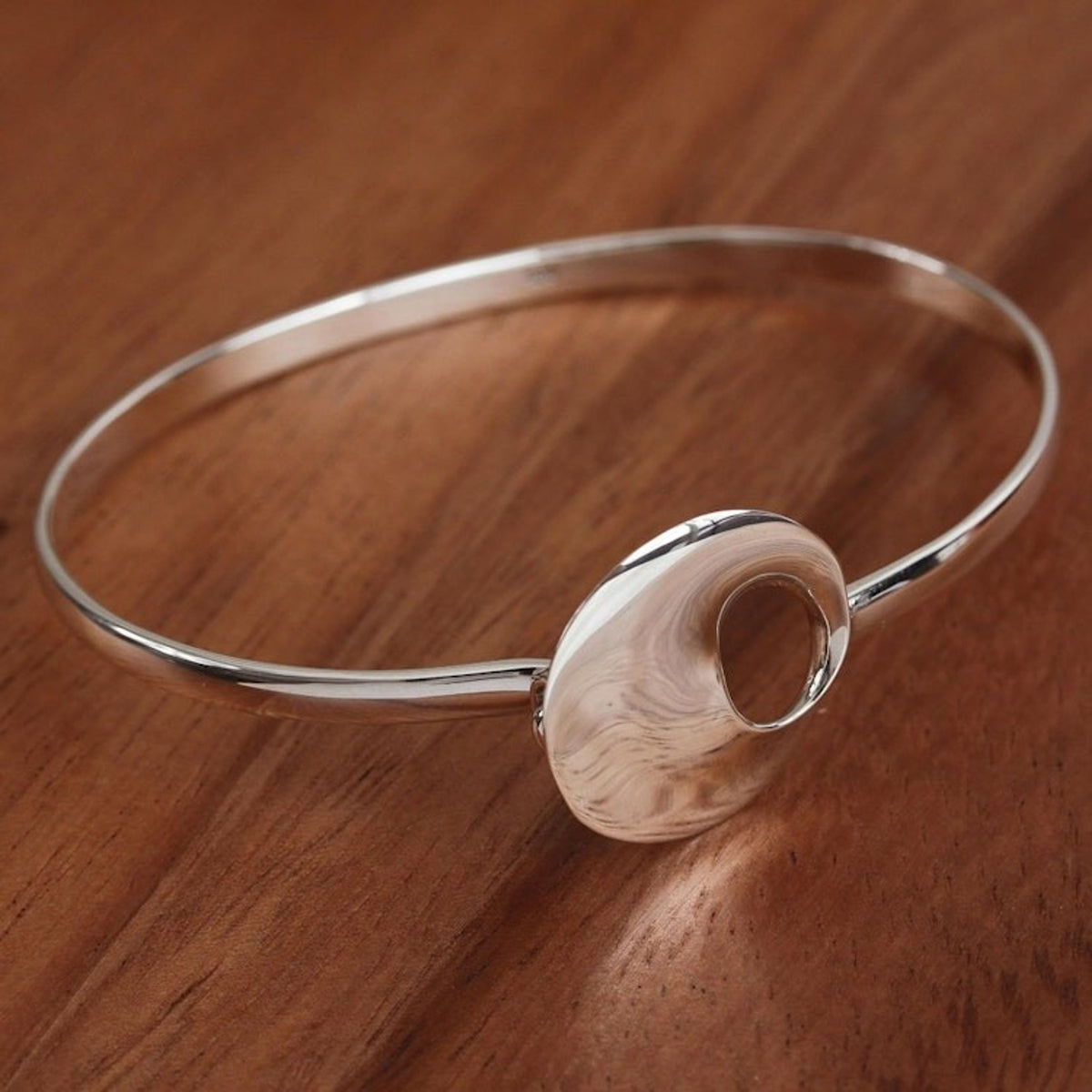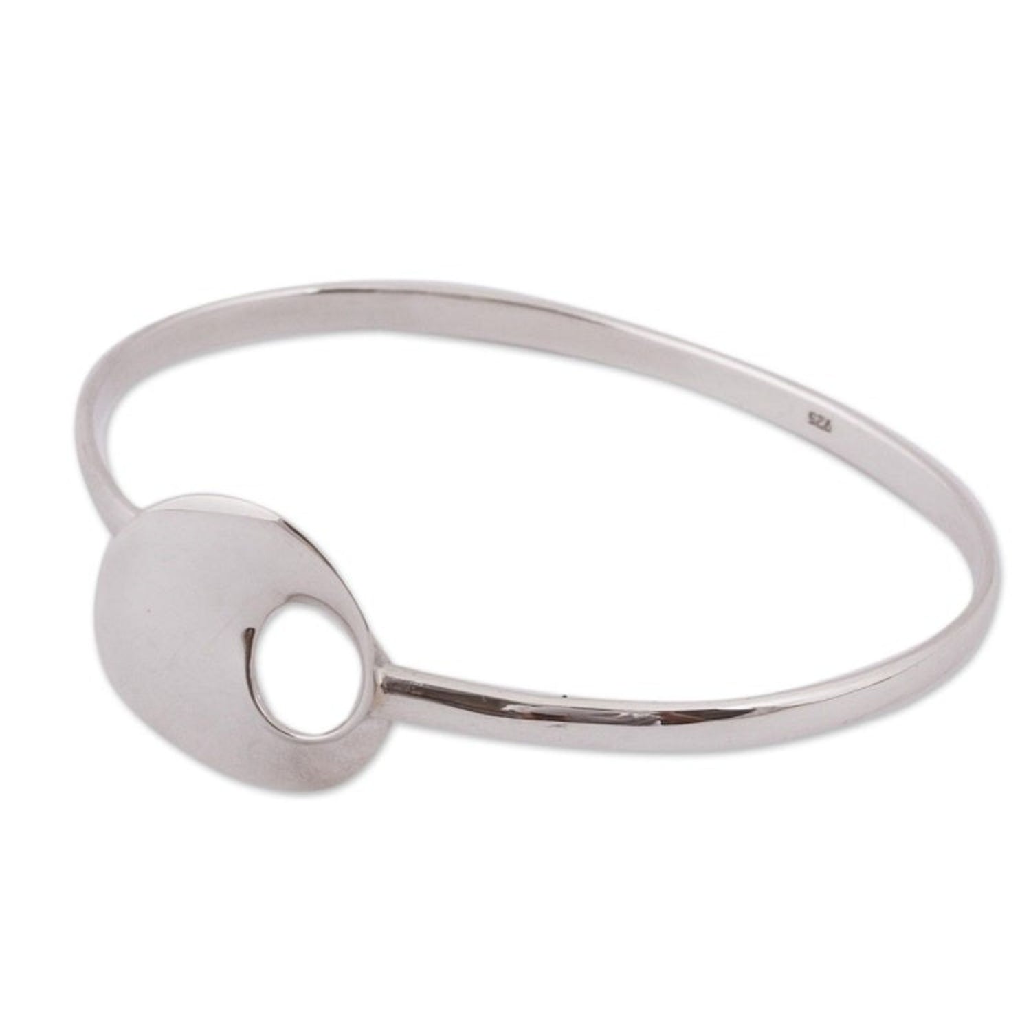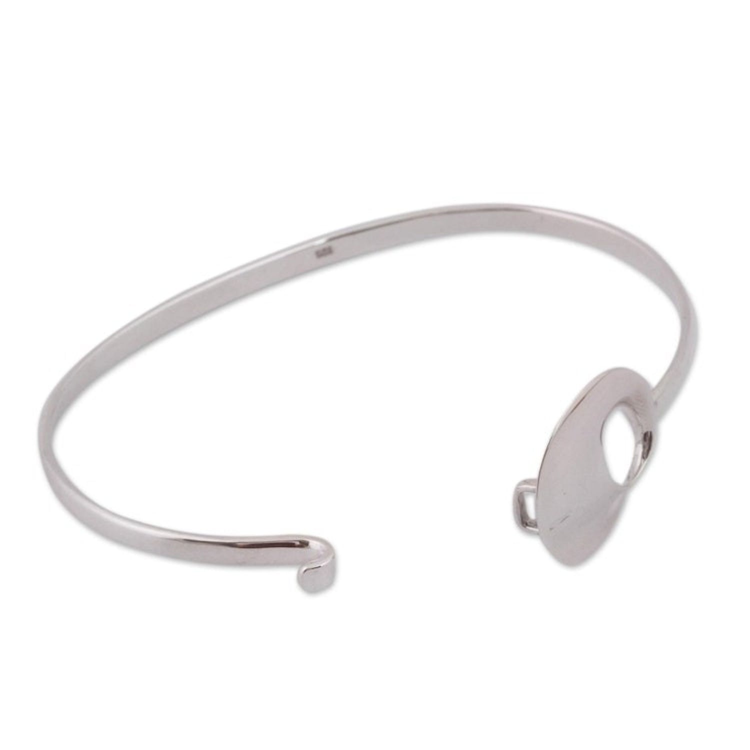 This Modern Sterling Silver Pendant Bracelet from Mexico 'Modern Orbit' is a modern and creative accessory by Graeme and Philip Watson. The sterling silver bracelet centers an oval pendant that bends the light in creative ways. The simple sterling band circles the wrist. The piece reflects the duo's commitment to preserving the Taxco silversmithing legacy and their belief that jewelry is a way to preserve a centuries-old craft.