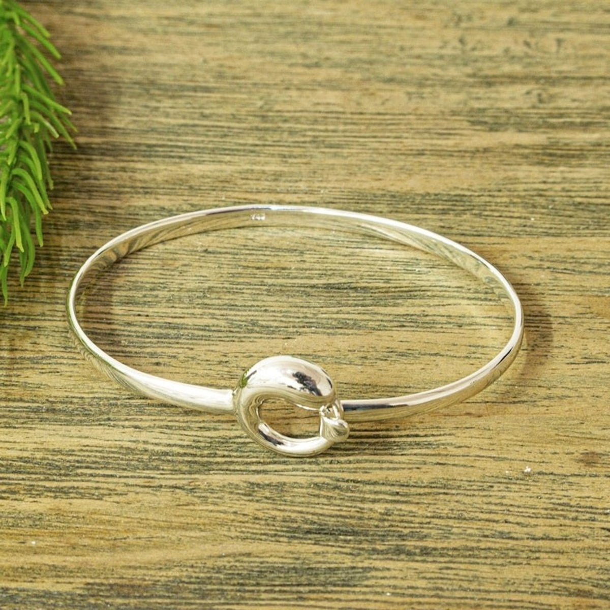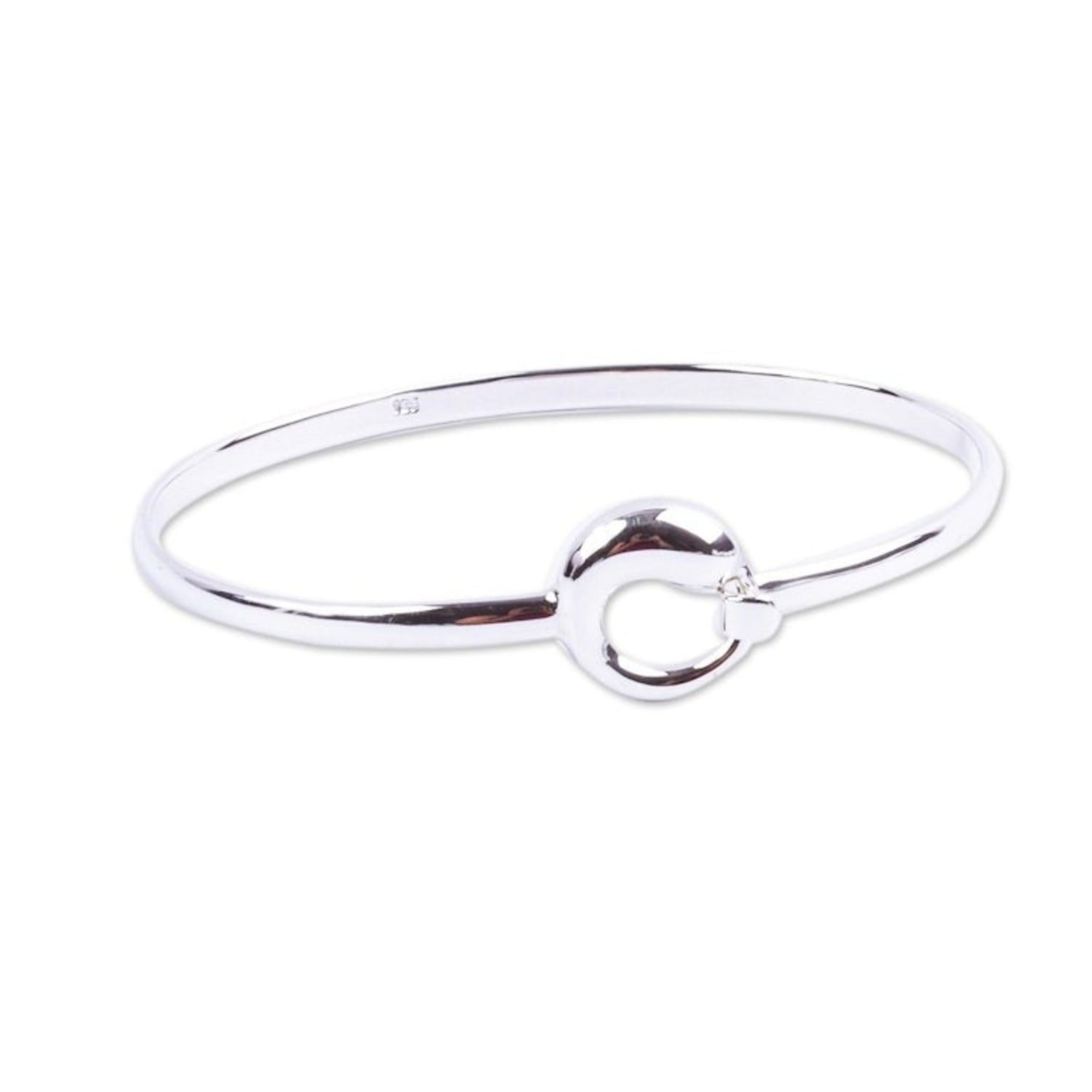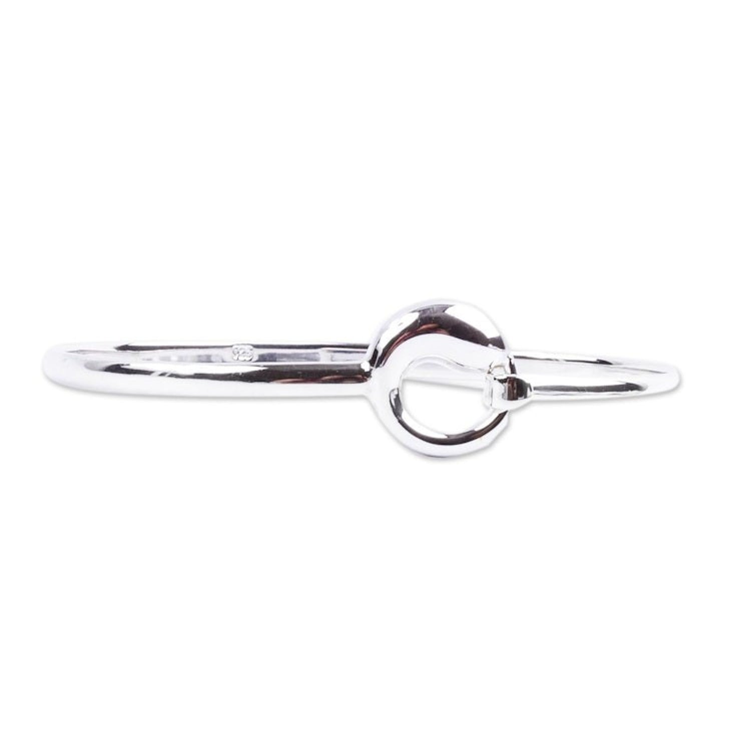 Crafted in Mexico from .925 sterling silver, this bangle bracelet has a high polish finish and an S-hook or hook clasp. It measures 6.8 inches in inner circumference.