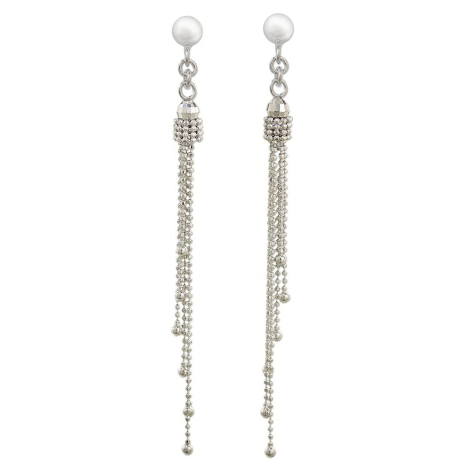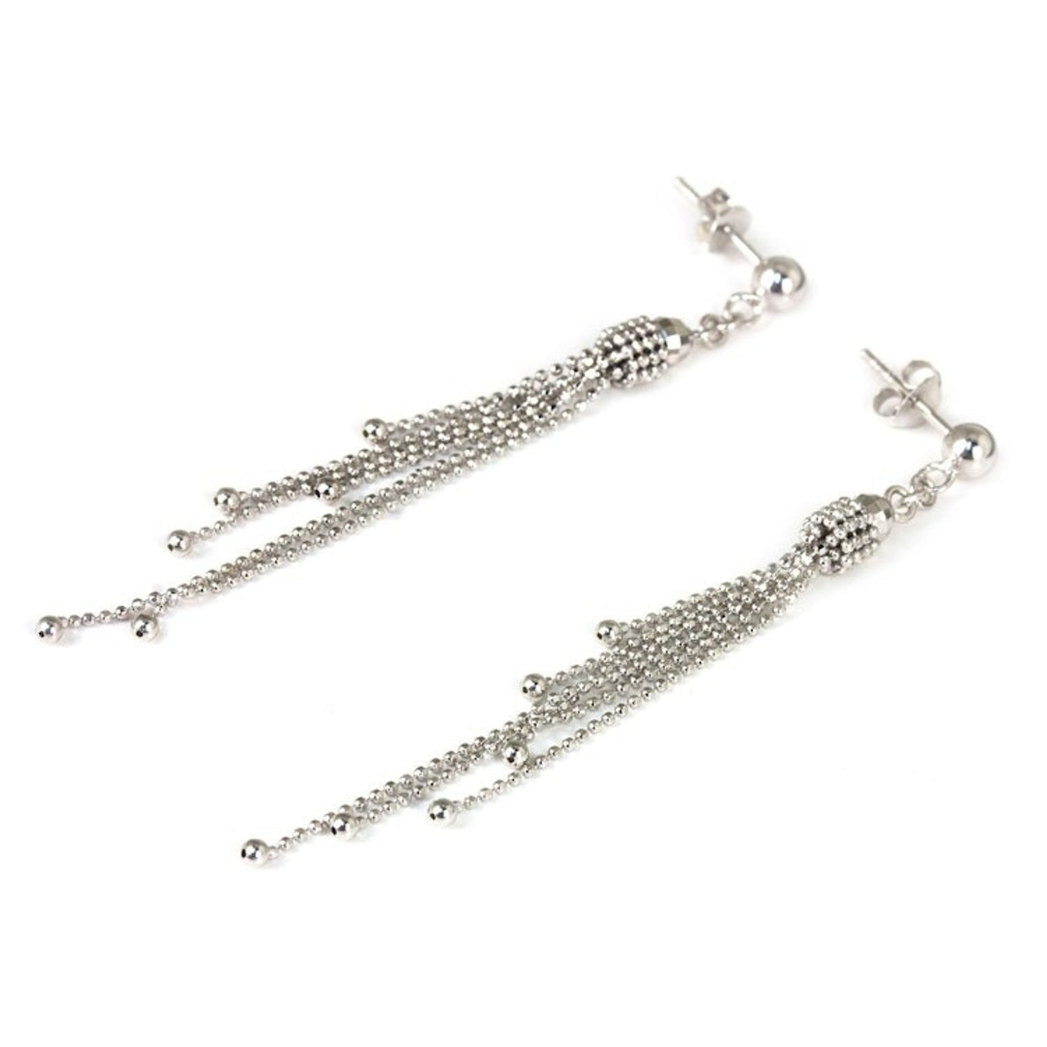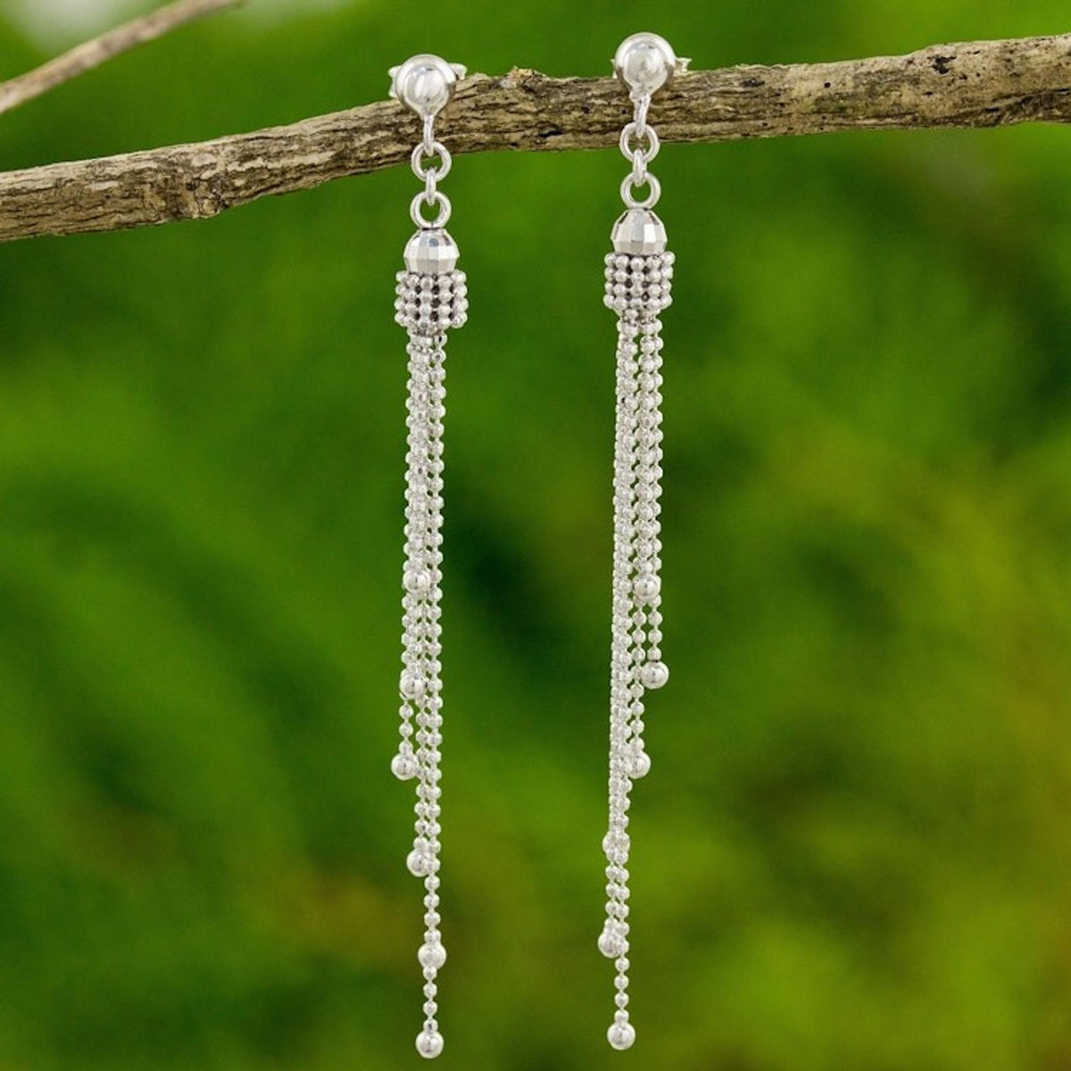 These Modern Thai Earrings Handcrafted in 925 Sterling Silver 'Scintillating Waterfall' are an original and elegant accessory by Angels. Like droplets of water, tiny globes cascade in a torrent of light. Angels handcrafts original sterling silver earrings with slender ball chains. The piece reflects Angels' ability to continue the family legacy, crafting intricate silver chains that embody both tradition and refinement.