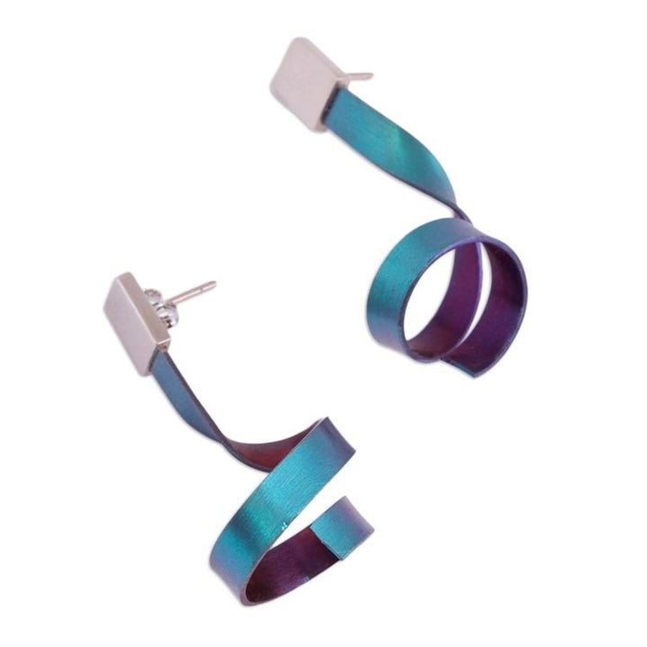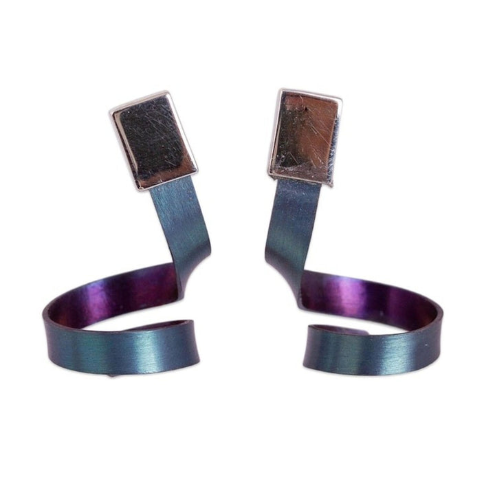 These Modern Titanium Plated Sterling Silver Drop Earrings 'Modern Ribbons' are an elegant and unique accessory by Mexican artisan Diana Solis. The drop earrings feature two ribbons that descend from the ears. They are handcrafted of sterling silver with a gleaming titanium plating, which gives them a blue and purple-tone finish. The piece reflects Carmen's commitment to keeping tradition alive while modernizing for the young.