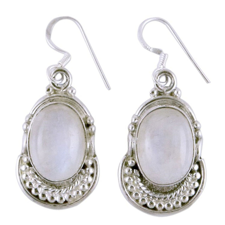 Handcrafted in India from sterling silver and moonstone, these hook earrings measure 1.5 inches long by 0.6 inches wide by 0.3 inches deep. The stones total 10 carats.