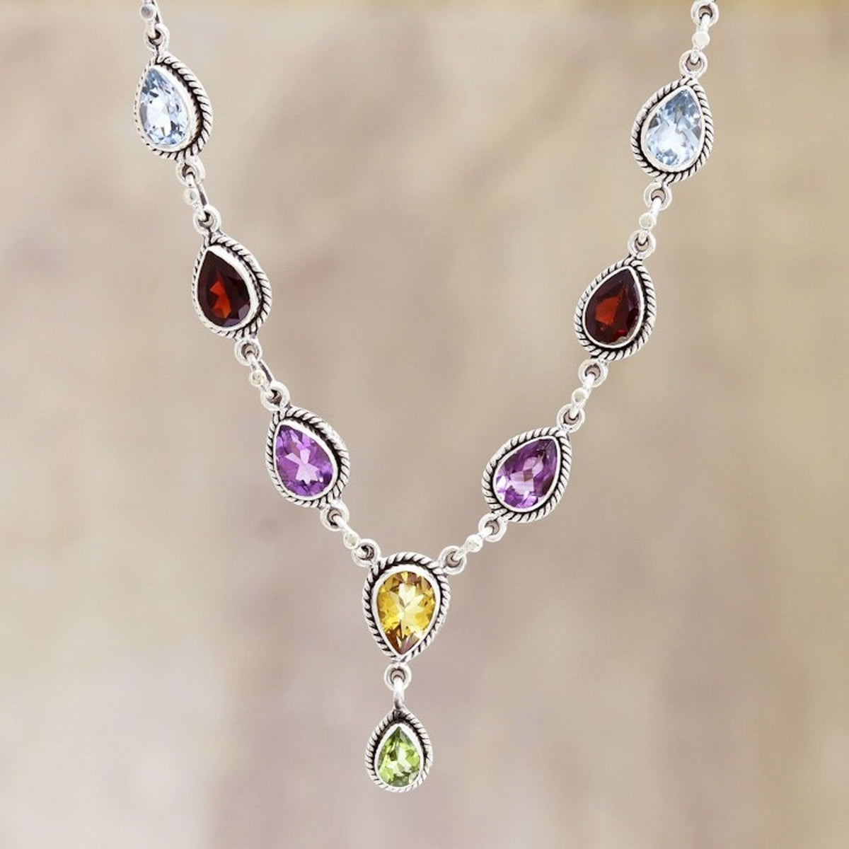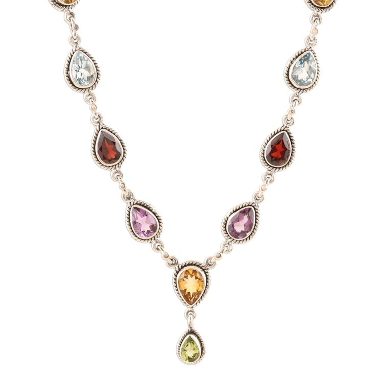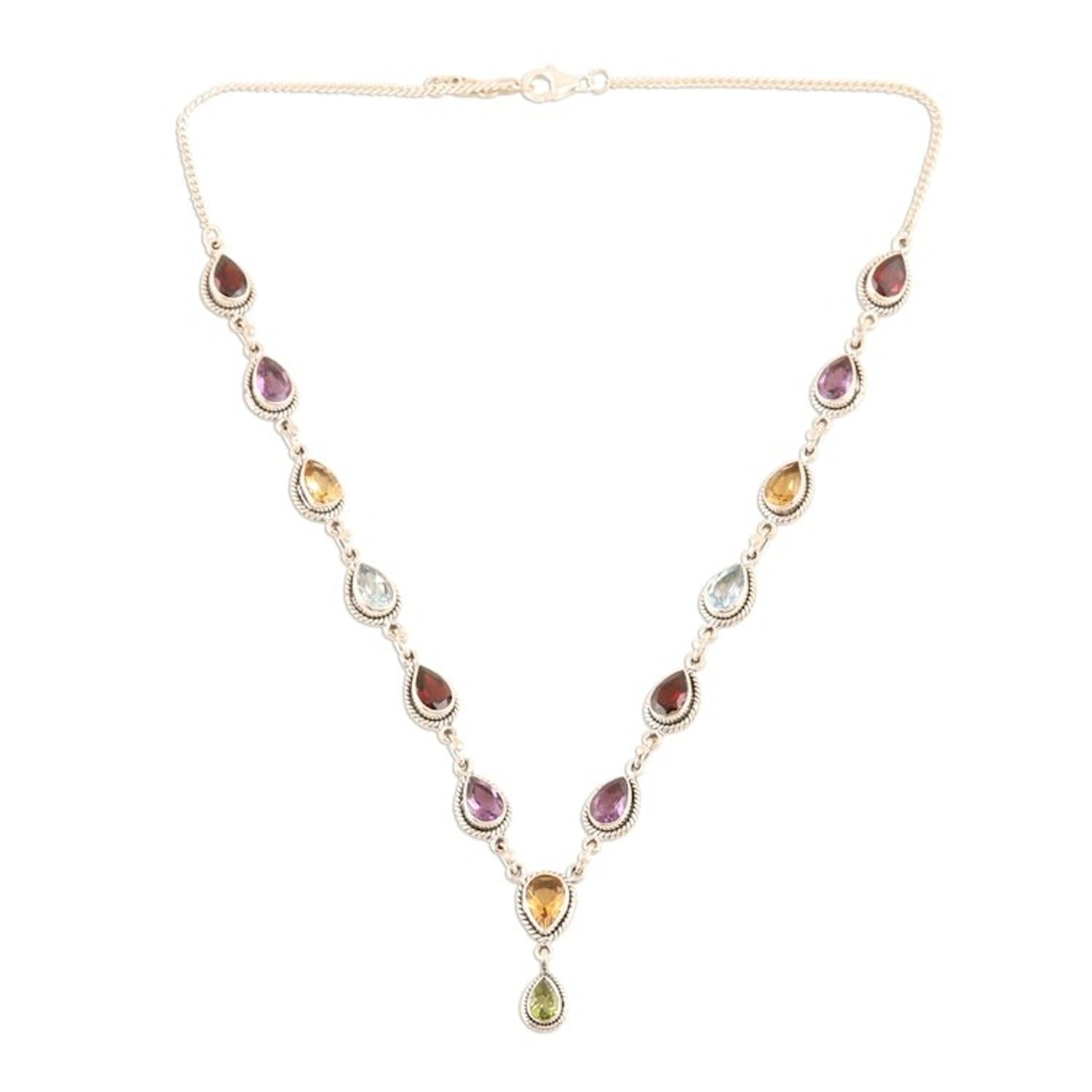 Handcrafted in India from .925 sterling silver, garnet, amethyst, citrine, blue topaz, and peridot, this necklace has a high polish finish and a lobster claw clasp. The necklace measures 17.3 inches minimum to 18.3 inches maximum long, with a 0.4-inch width and 2 mm width. The pendant measures 1.4 inches long by 0.5 inches wide by 0.3 inches deep. The stone's color may vary slightly.