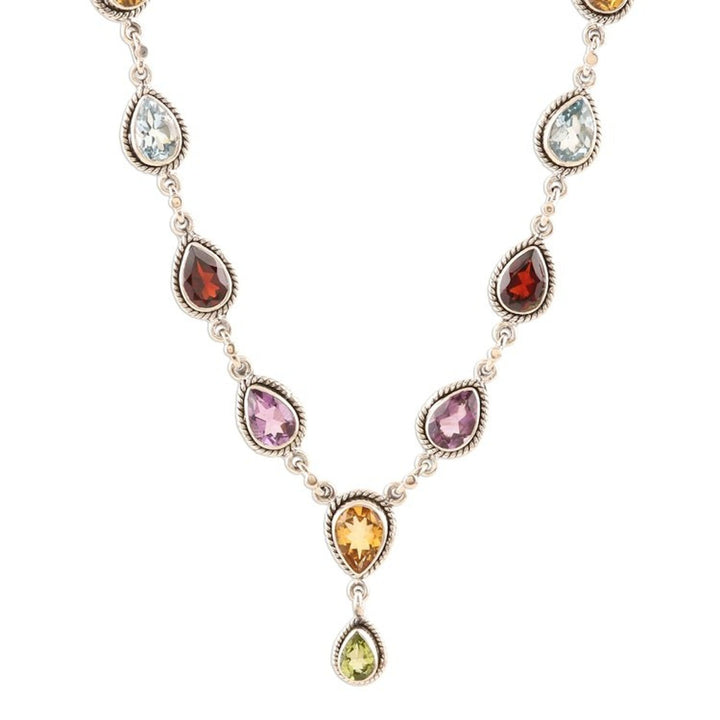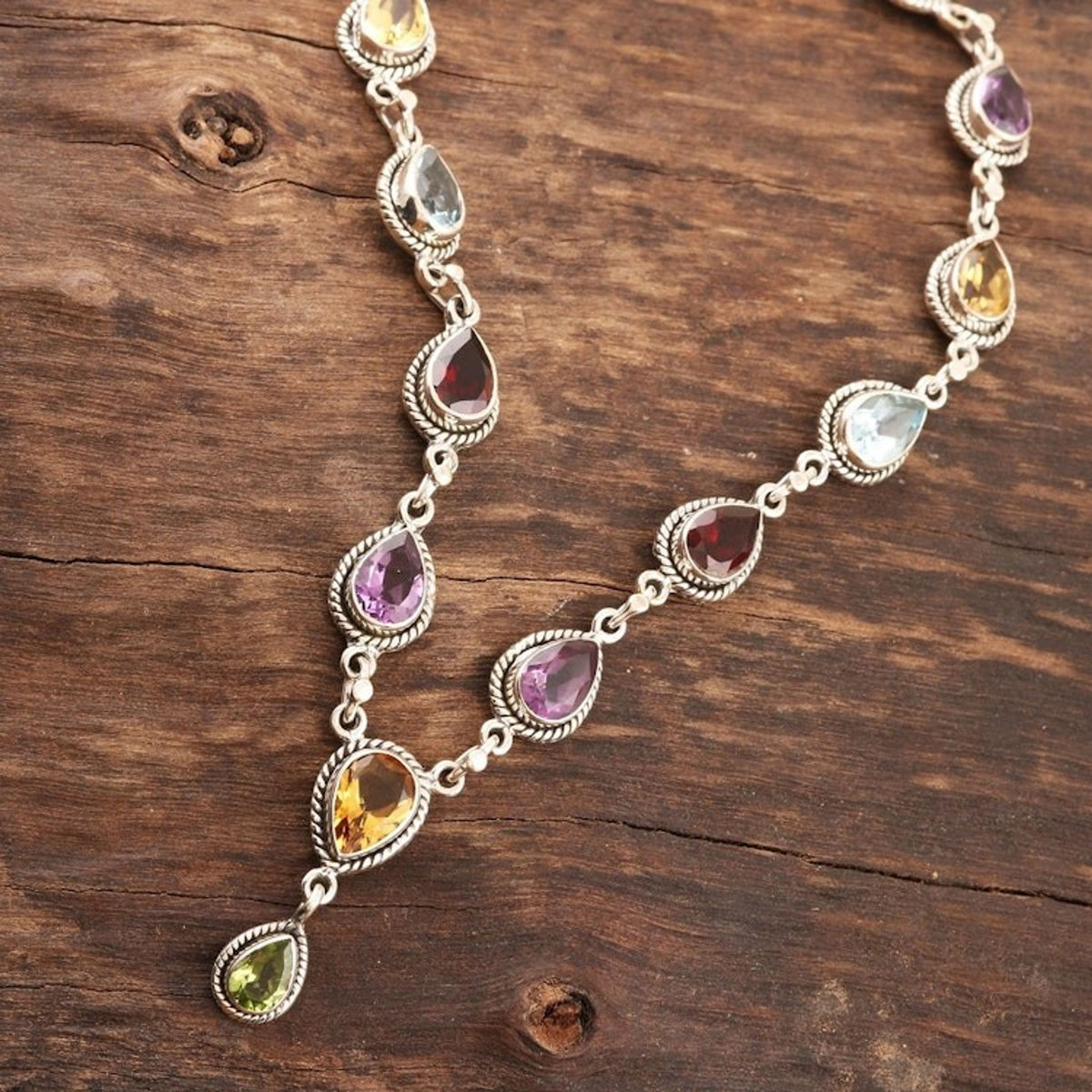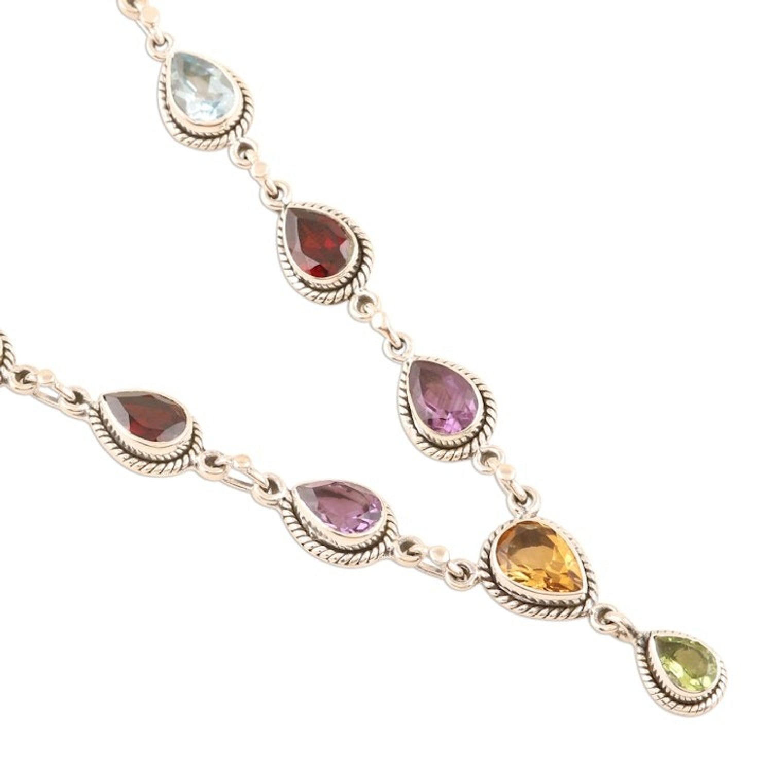Handcrafted in India from .925 sterling silver, garnet, amethyst, citrine, blue topaz, and peridot, this necklace has a high polish finish and a lobster claw clasp. The necklace measures 17.3 inches minimum to 18.3 inches maximum long, with a 0.4-inch width and 2 mm width. The pendant measures 1.4 inches long by 0.5 inches wide by 0.3 inches deep. The stone's color may vary slightly.