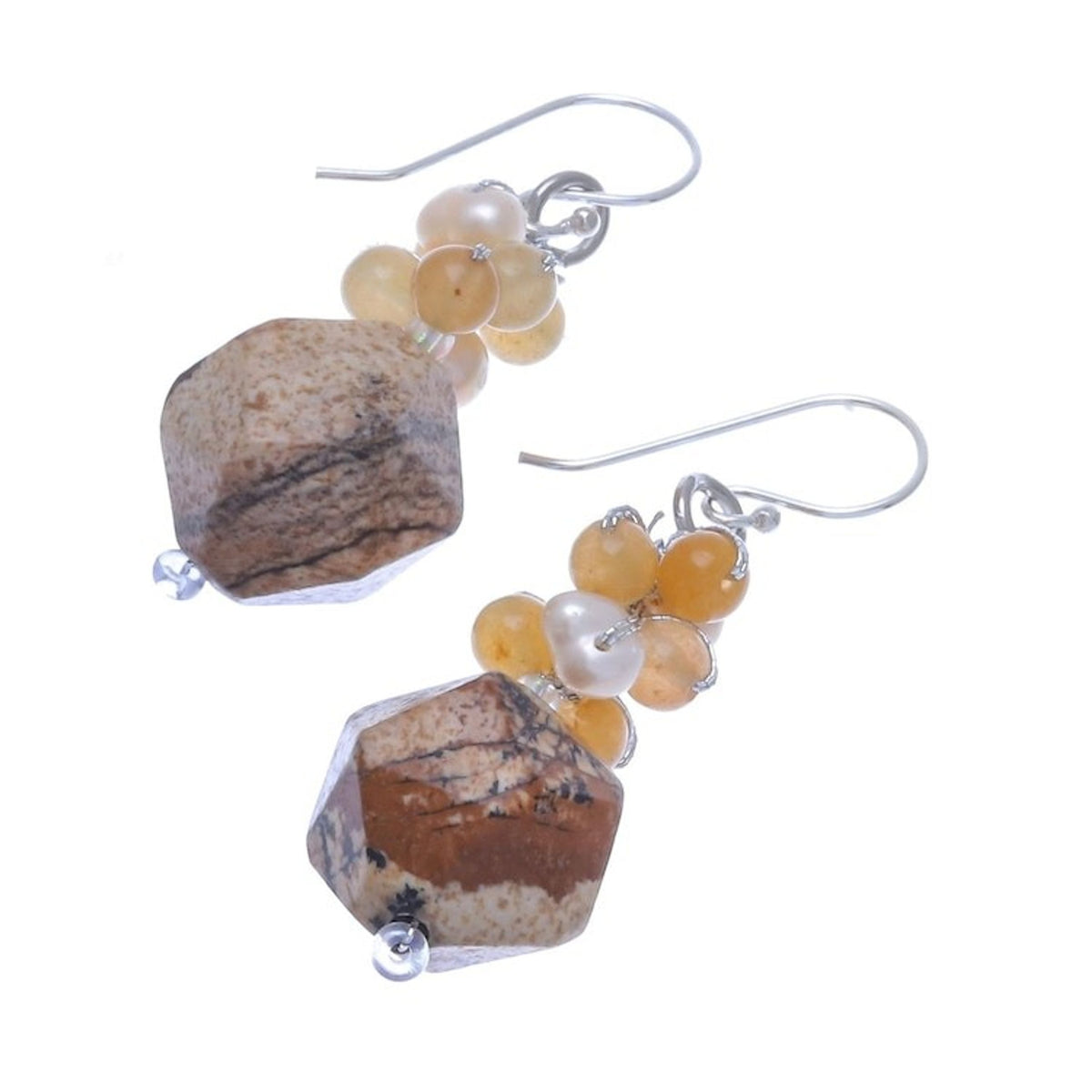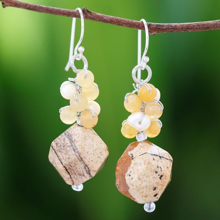 These Multi-Gemstone Beaded Cluster Earrings in Brown 'Beautiful Glam in Brown' are beautiful and glamorous accessories by Thai artisan Nareerat. Falling below beaded clusters of yellow quartz, white cultured pearl, and glass, two faceted gemstones of earthy jasper total an impressive 33 carats. The earrings swing from hooks of sterling silver. The piece reflects Nareerat's commitment to creating handcrafted jewelry that celebrates the beauty of nature and color, as she works to preserve delicate manual techniques in the digital age.