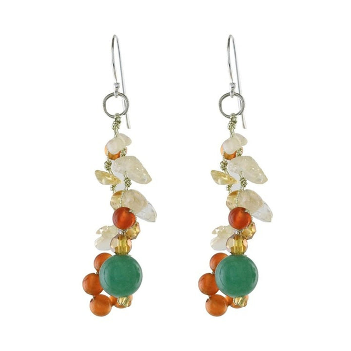 These Multi-Gemstone Cluster Sterling Silver Dangle Earrings 'Vivacious Color' are a vivacious and colorful accessory by Thai artisan Nareerat. The clusters of gemstones on these dangle earrings are full of vivacious color. They feature round beads of carnelian, dyed green quartz, and orange glass, combined with chips of citrine, all threaded together and hanging from sterling silver hooks. The piece reflects Nareerat's commitment to creating handcrafted jewelry that celebrates the beauty of nature and color, as she works to preserve delicate manual techniques in the digital age.