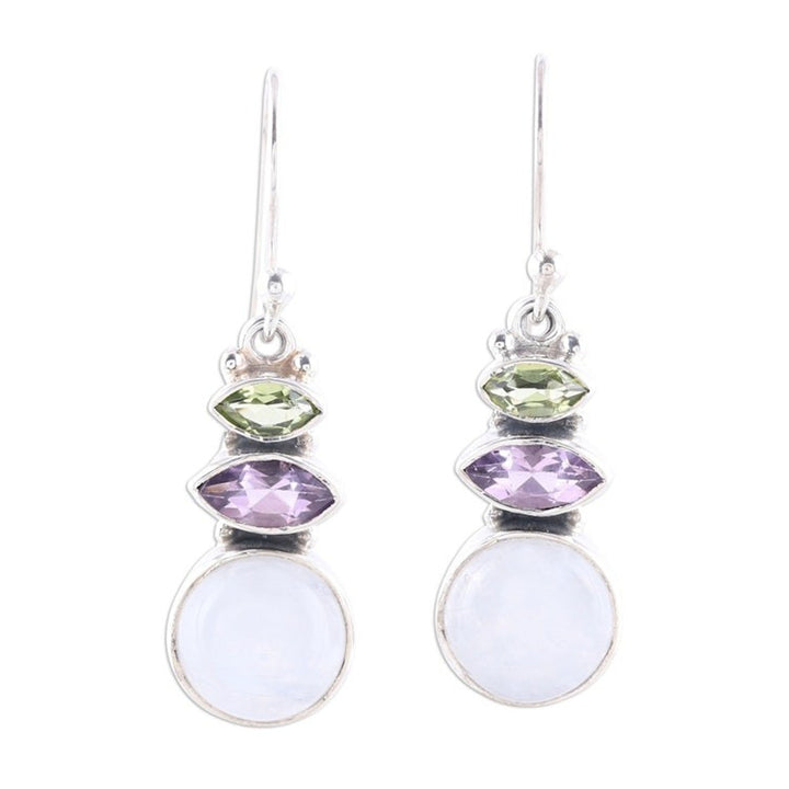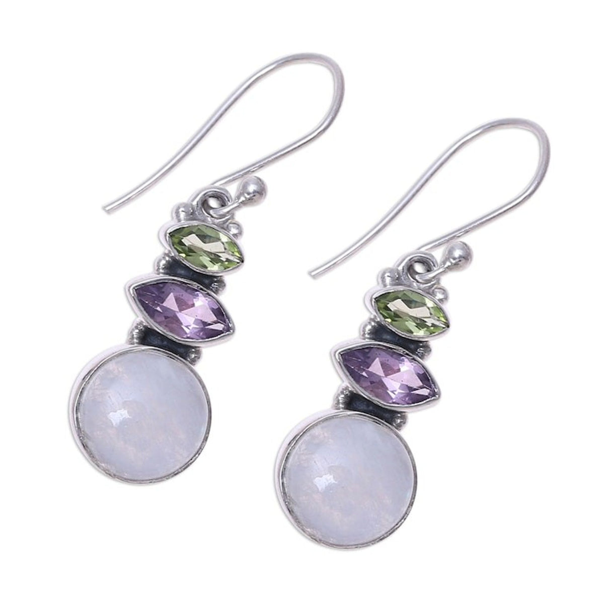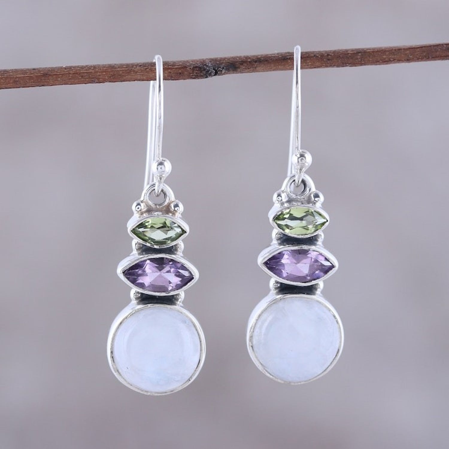 These Multi-Gemstone Dangle Earrings from India 'Peaceful Dazzle' are a peaceful and beautiful accessory by India's Shanker. Each earring features marquise gems of amethyst and peridot that are displayed above a cabochon of natural rainbow moonstone, framed by sterling silver. The piece reflects Shanker's commitment to quality and originality, as he creates sterling silver jewelry celebrated for its craftsmanship and artistry.