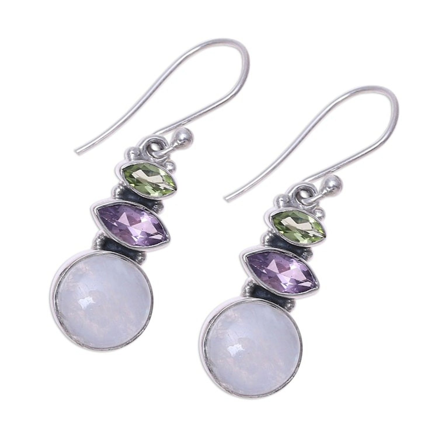 Handcrafted in India from .925 sterling silver, rainbow moonstone, amethyst, and peridot, these hook earrings have a combination finish. They measure 1.5 inches long by 0.4 inches wide by 0.3 inches deep. The stone's color may vary slightly.