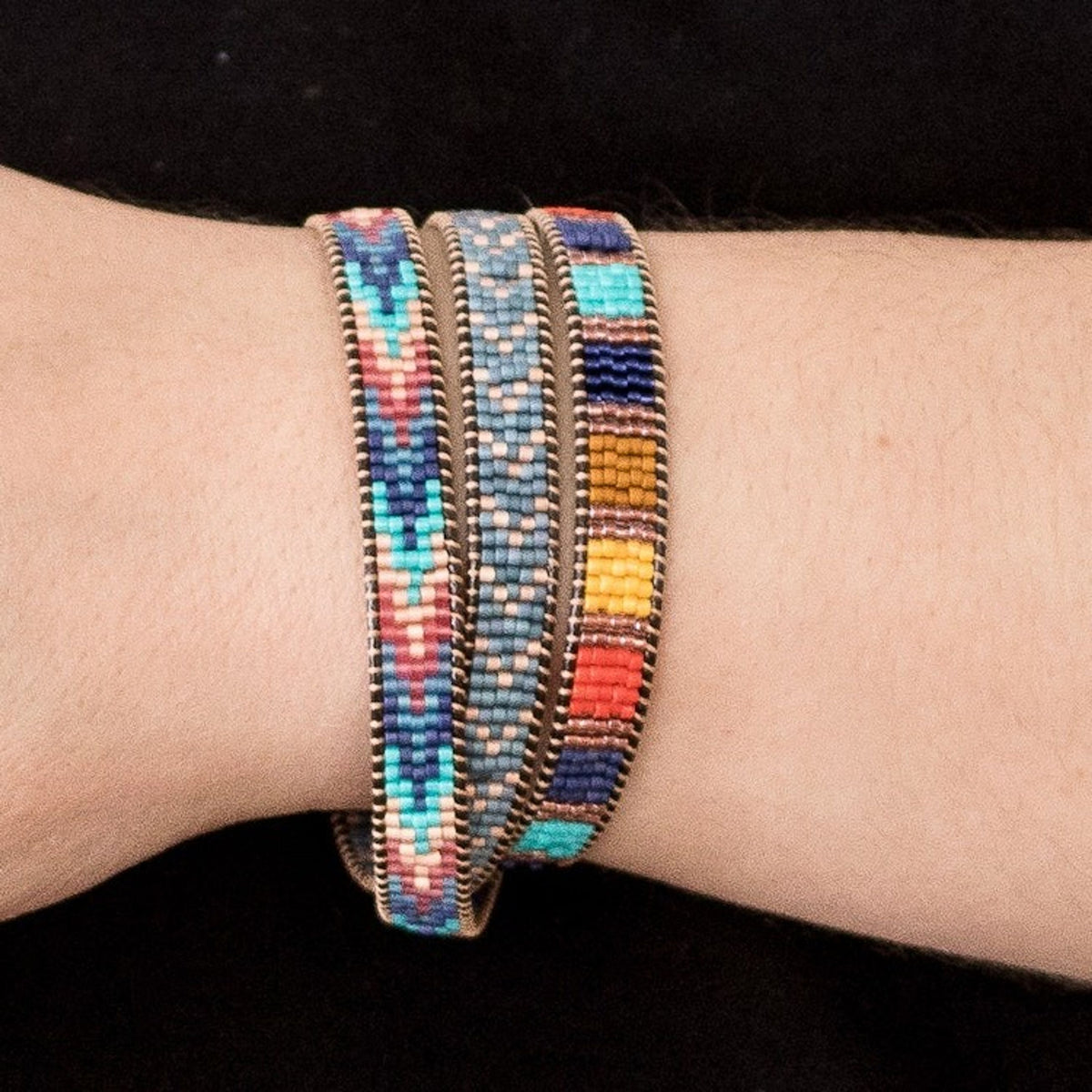 These 'Streets of Antigua' wrap bracelets by Independent Artisans are a vibrant and joyful expression of Guatemalan artistry. Inspired by the colorful buildings and cobblestone streets of Antigua, Alvaro Ratzán meticulously handcrafts each piece, stringing tiny glass beads on a loom to create a rich geometric motif. The design reflects the traditional Mayan embroidery of his community's handwoven huipiles, carrying a profound sense of tradition and pride. Each bracelet tells a story of livelihood and legacy, a vessel of tradition and sacrifice that ensures the preservation of artisan craft. Perfect for adding a pop of color to any look, these bracelets are both a tribute to a beautiful city and a symbol of cultural heritage. Each piece will vary slightly, making it truly unique to the wearer.