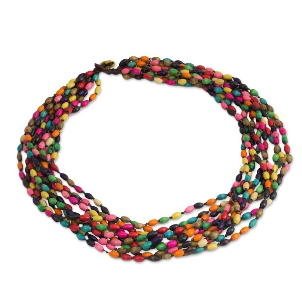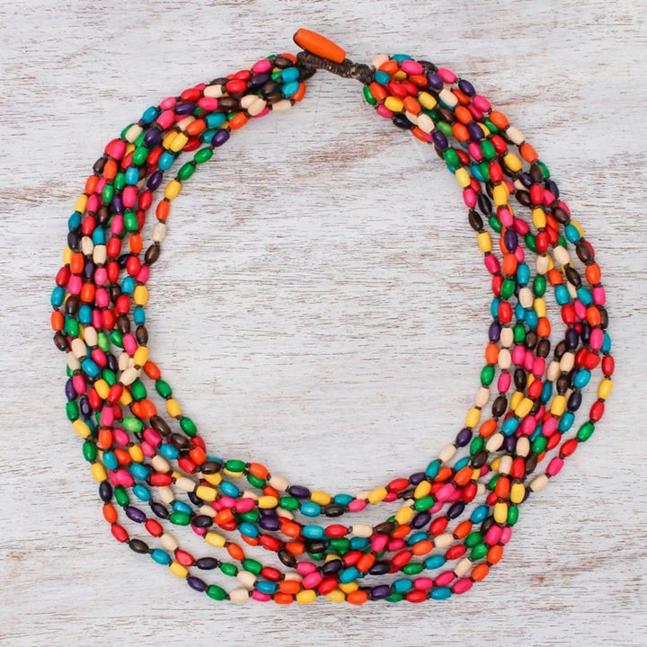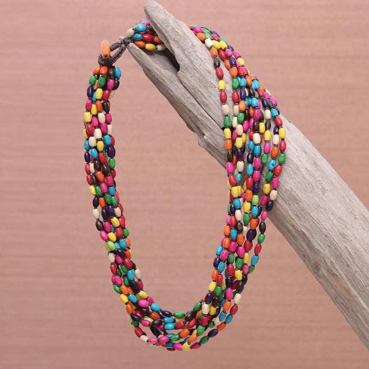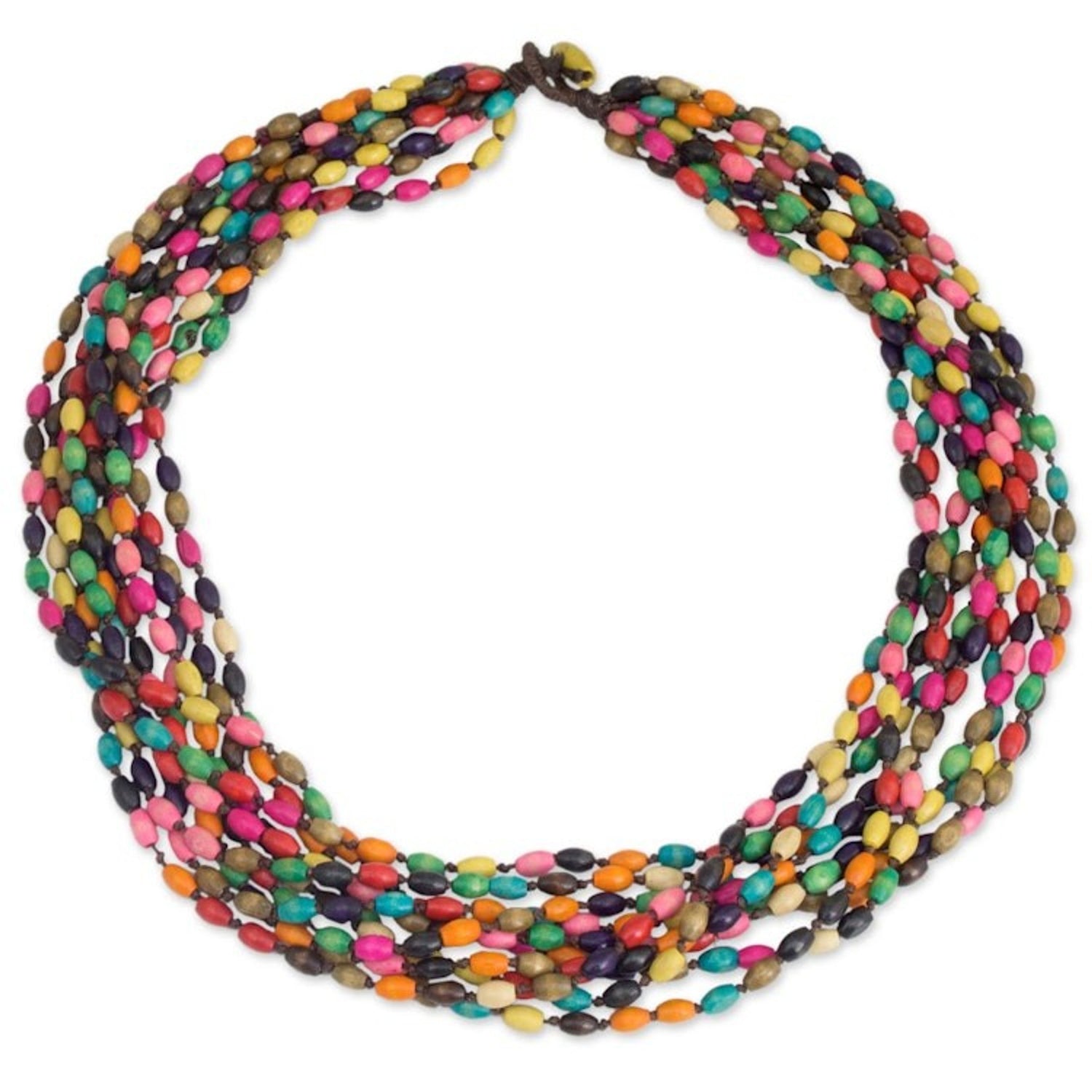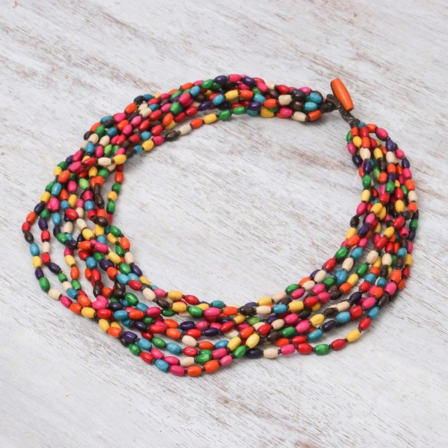 This 'Songkran Belle' necklace by Independent Artisans is a beautiful testament to the power of transformation and community. Inspired by her journey from hardship to empowerment, Sumalee Nawakul hand-knots ten strands of vibrant, rice-shaped beads carved from littleleaf boxwood. The result is a lightweight and colorful necklace that embodies the vibrant spirit of Thai craftsmanship. It represents not only her own success but also her dedication to uplifting others, as she works with older community members who find purpose and income through her designs. This piece is a celebration of simple beauty and the profound joy of helping others, making it a truly meaningful accessory.