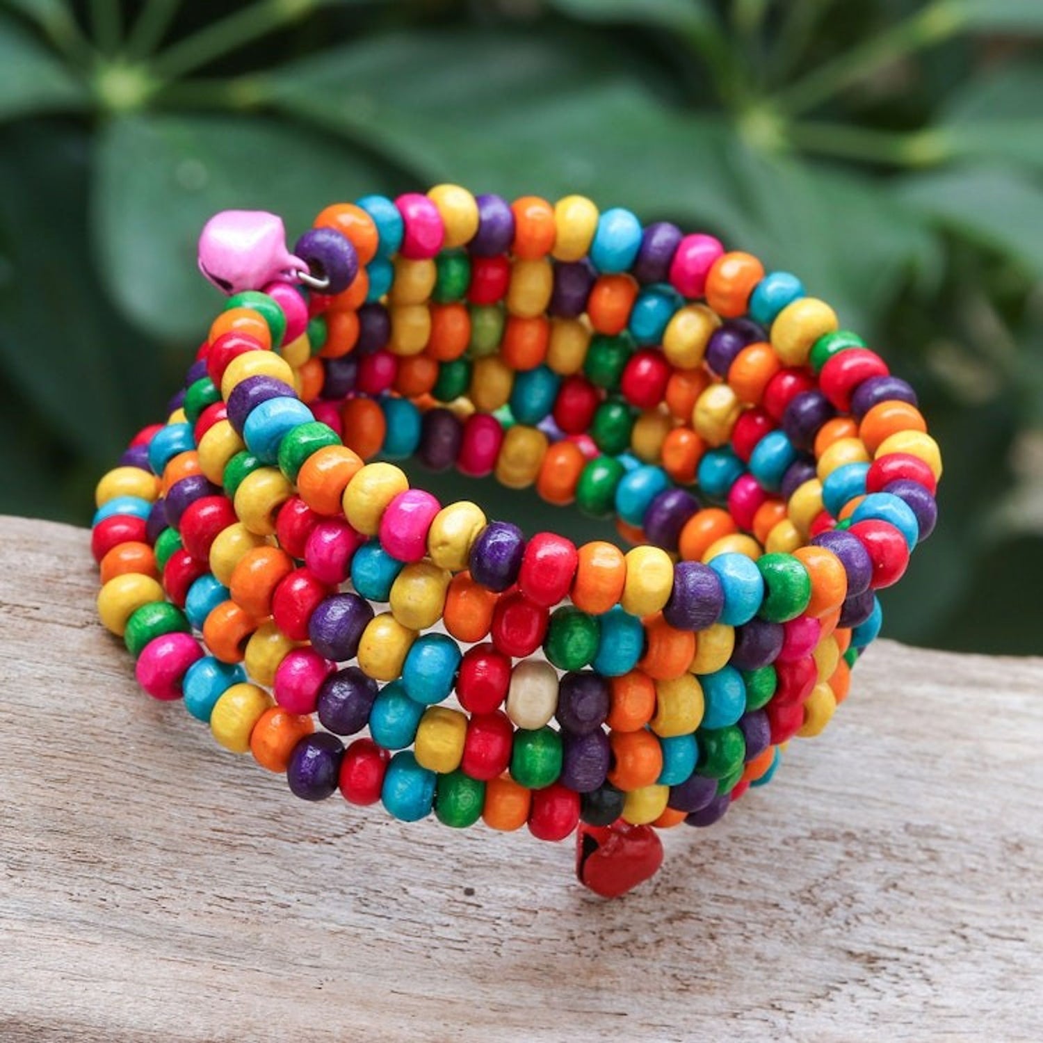 This 'Bubblegum Spin' wrap bracelet by Independent Artisans is a charming and whimsical accessory. Handcrafted by Sumalee Nawakul, petite globes of colorful littleleaf boxwood evoke the joyful and nostalgic image of bubblegum balls. The bracelet wraps multiple times around the wrist, creating a playful and dynamic pop of color. Each end is finished with a tiny bell, which adds a delightful and unique detail, giving the bracelet both movement and a subtle sound. This piece is a vibrant and cheerful addition to any wardrobe, handcrafted to bring a sense of fun and a touch of whimsy.