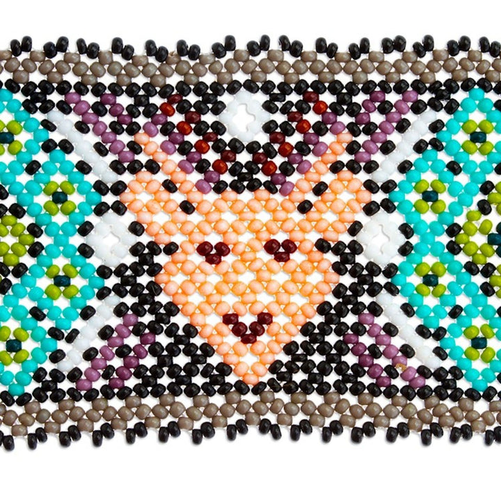 This 'Deer Totem' bracelet by Independent Artisans is a powerful and intricate tribute to Wixárika culture. Hand-strung with thousands of tiny glass beads on silken threads, this wide cuff-style wristband features a sacred Huichol-style deer motif at its center. For Angeles González, this piece is more than just jewelry; it is a language, a form of identity, and a way to preserve her native culture for future generations. The meticulous beadwork and deep symbolism make this bracelet a wearable work of art, a bridge between tradition and modern life that honors the spiritual and artistic heritage of the Wixárika people.