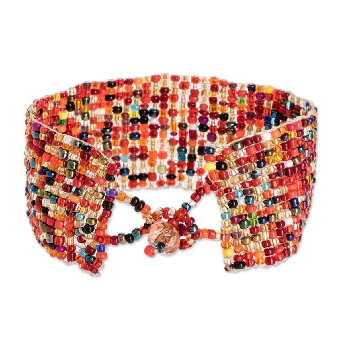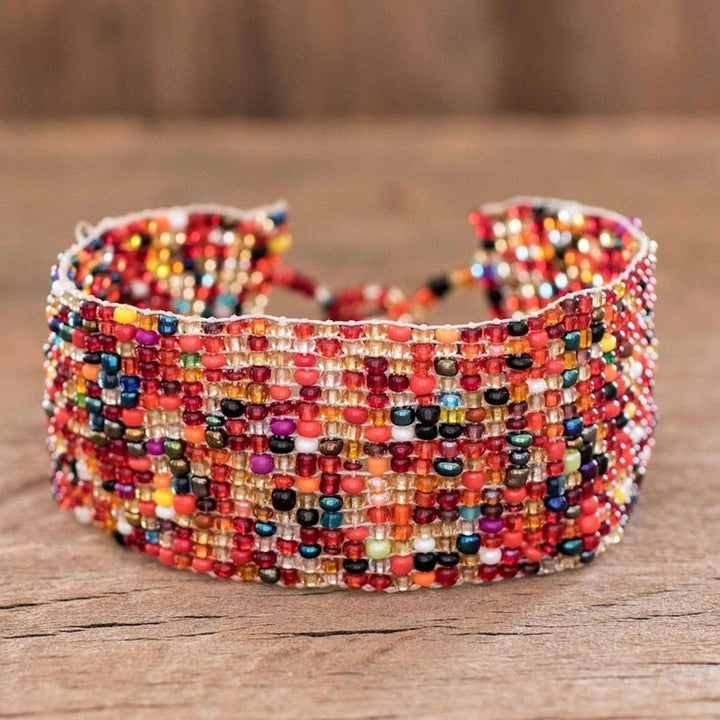 This 'Rainbow Road' bracelet by Independent Artisans is a beautiful symbol of community, resilience, and hope. Crafted by the Seed Bead Artisans of Santiago Atitlán, this wide wristband is made from tiny glass beads in a vibrant rainbow of colors. The design celebrates the lush flora and fauna of Guatemala and reflects the collective’s mission to empower women with financial independence and confidence. A sparkling crystal bead adds a touch of light and is used to secure the bracelet at two different lengths. This piece is a testament to the transformative power of artistry and a joyful expression of community spirit.