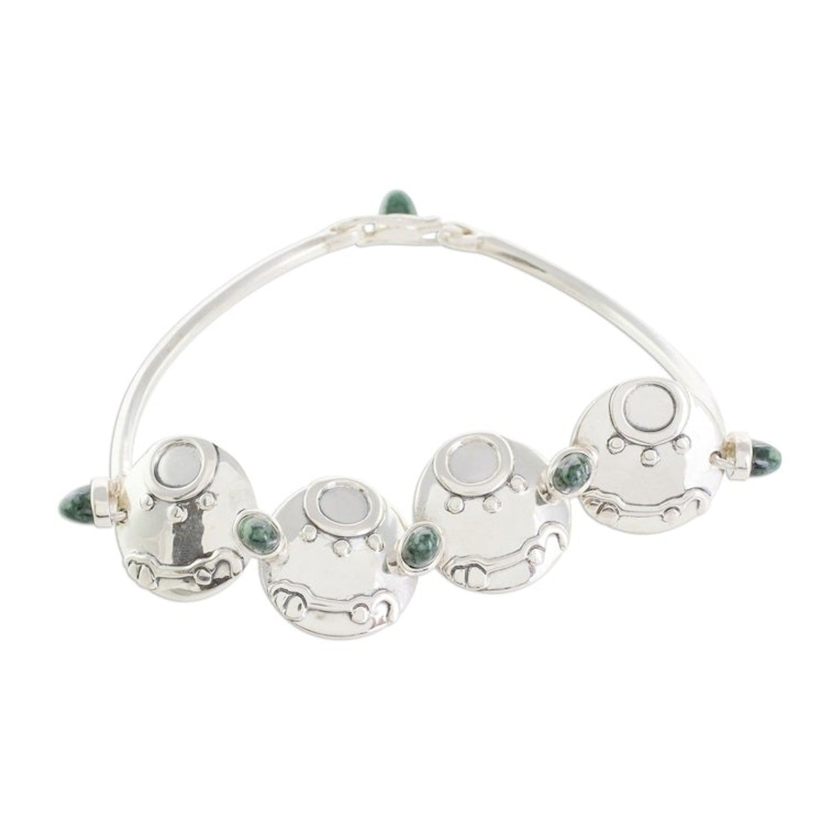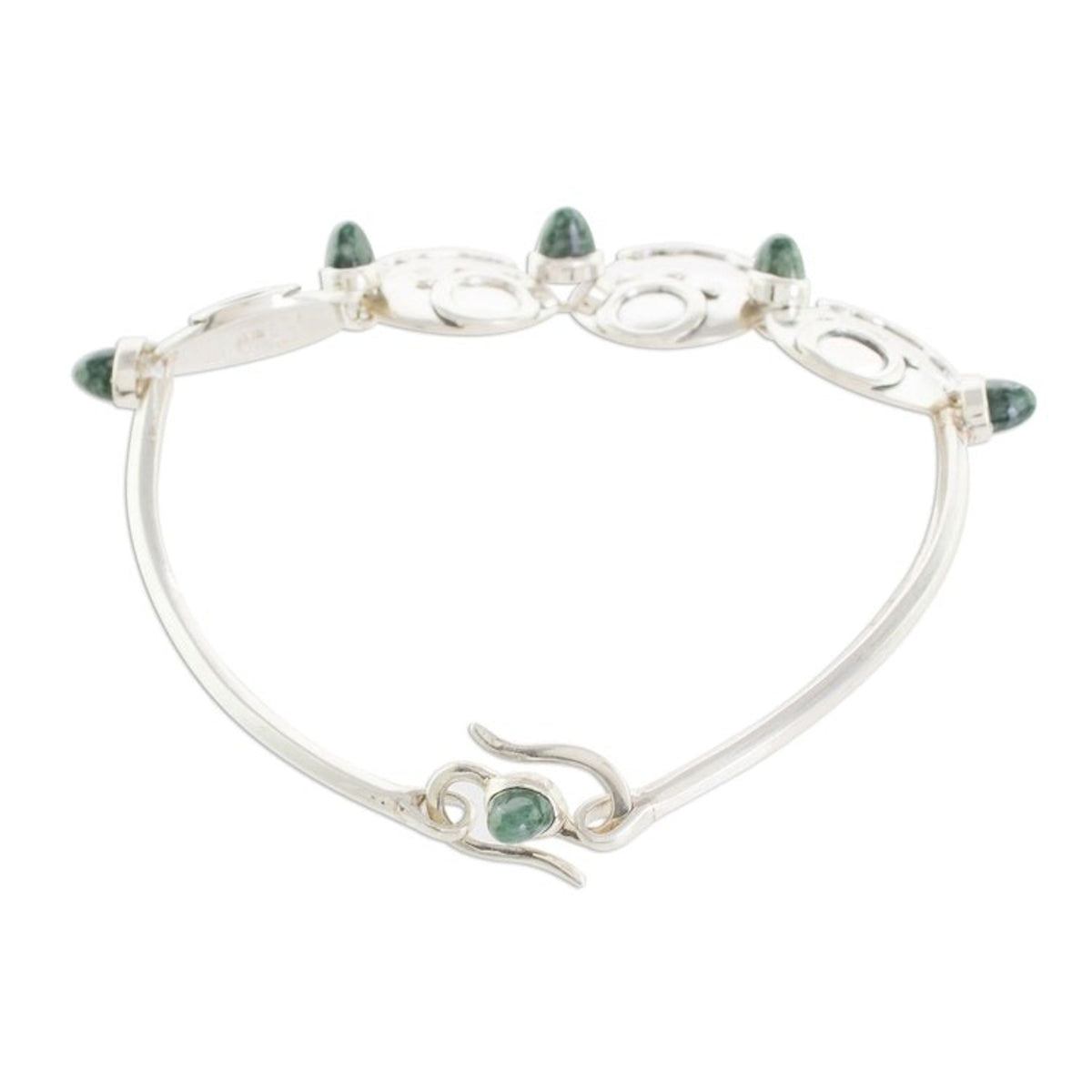 Handcrafted in Guatemala with 925 sterling silver and natural dark green jade, this 7-inch long bracelet has a high polish finish and fastens with an S-hook clasp.