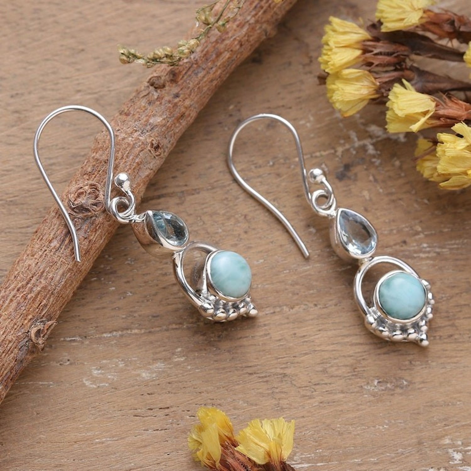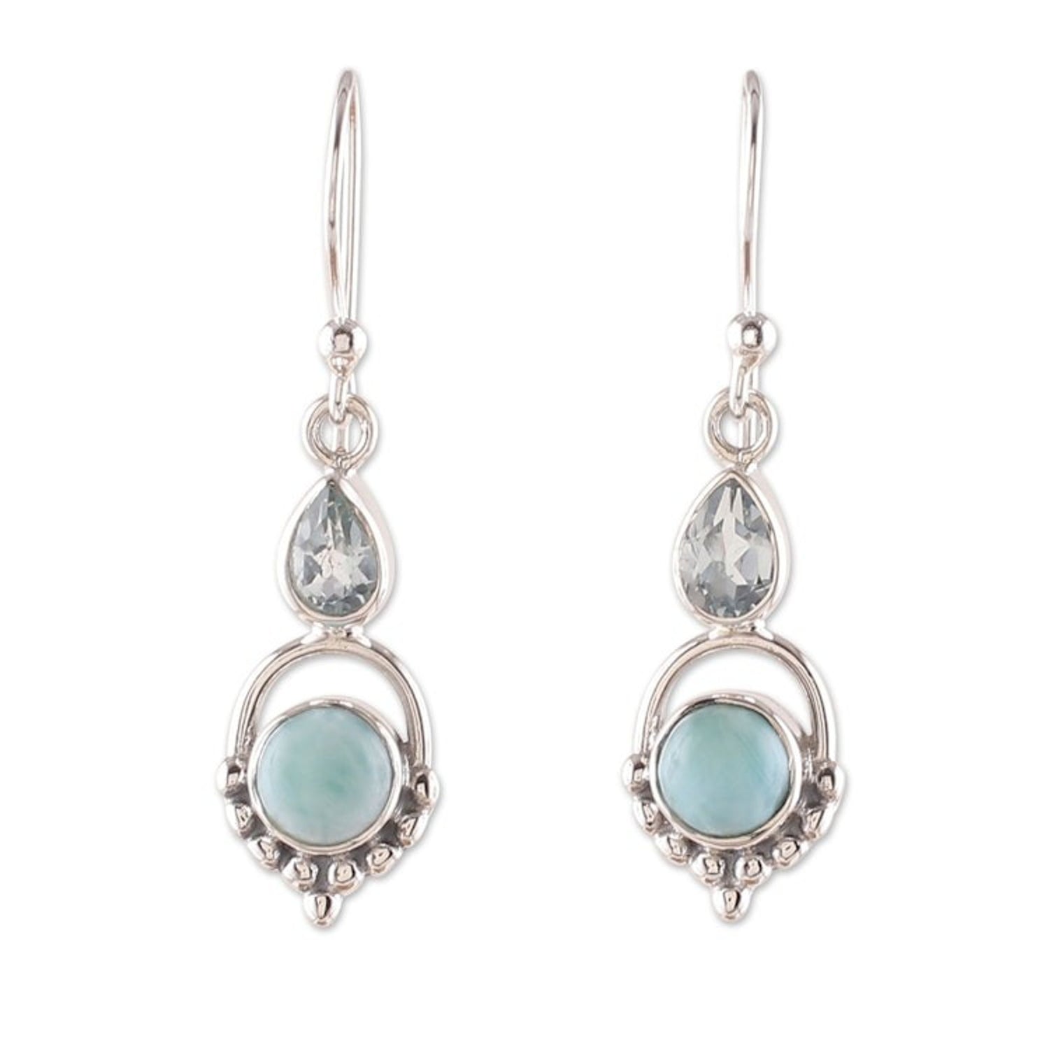 Handcrafted in India with .925 sterling silver, larimar, and blue topaz. The earrings are 1.5 inches in length and 0.4 inches in width. They have a combination finish. Color variations are to be expected.