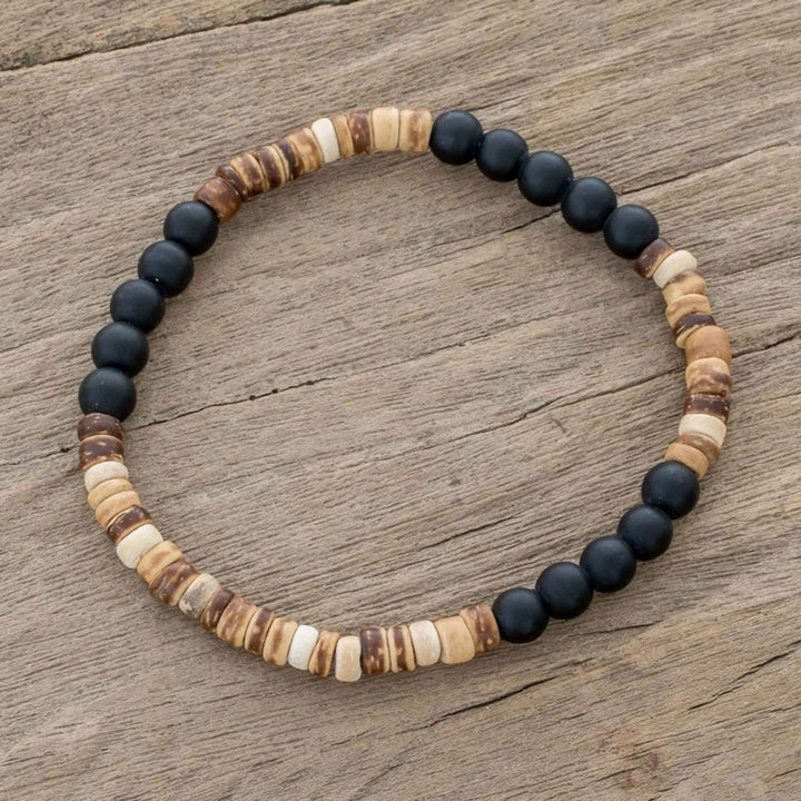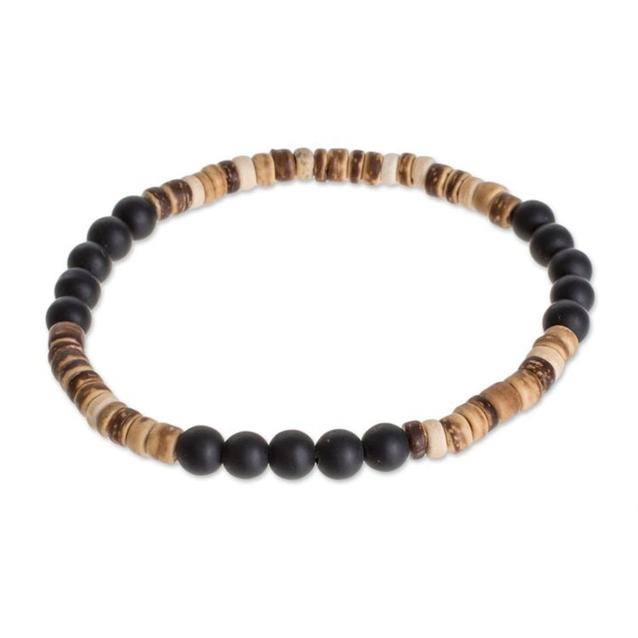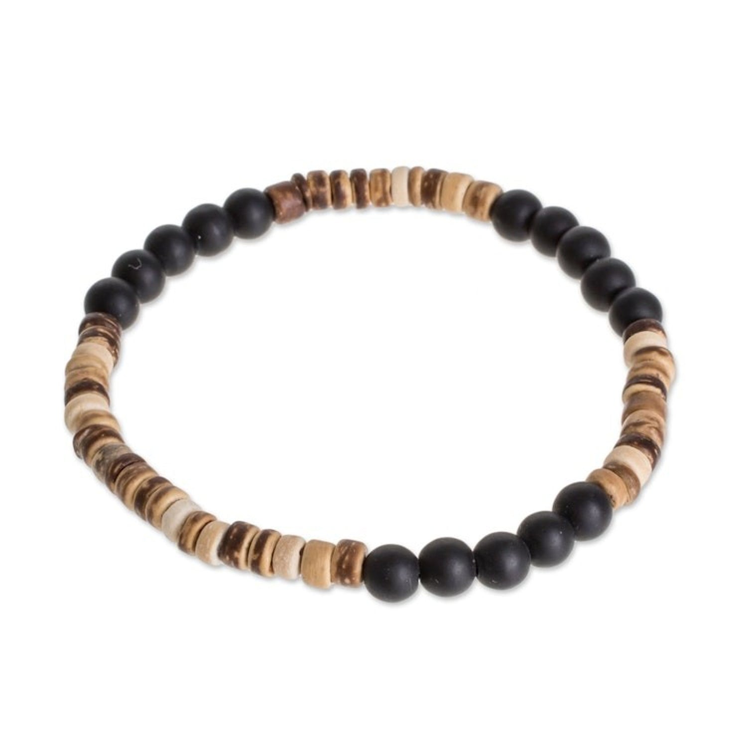 Onyx and Coconut Shell Beaded Stretch Bracelet 'Earthen Force'