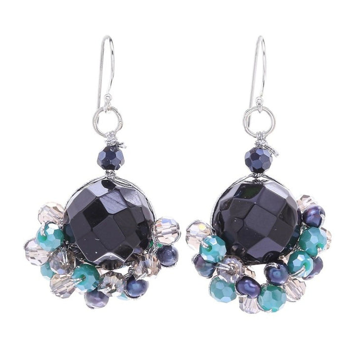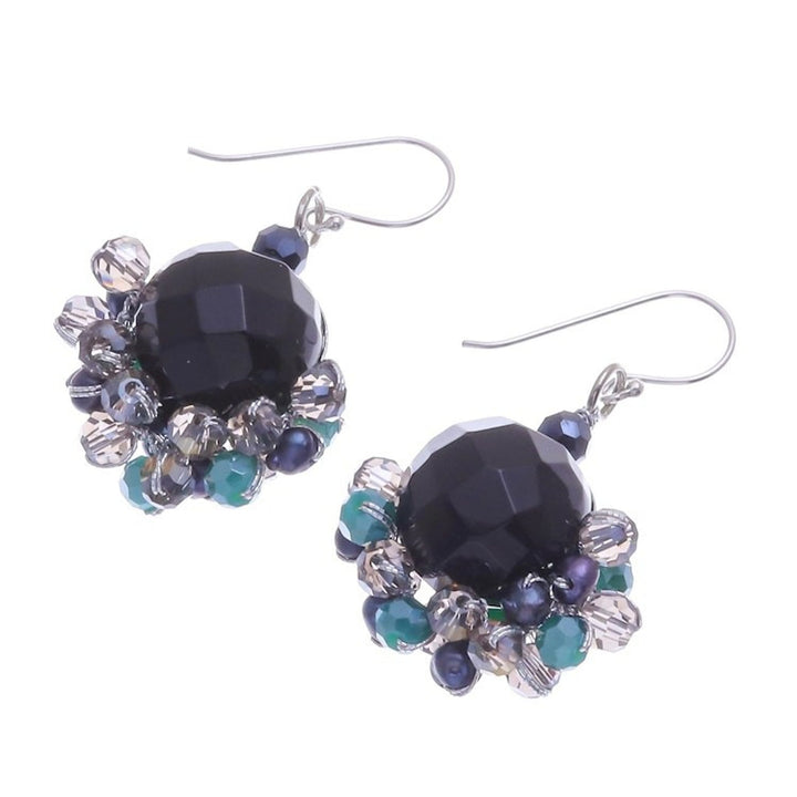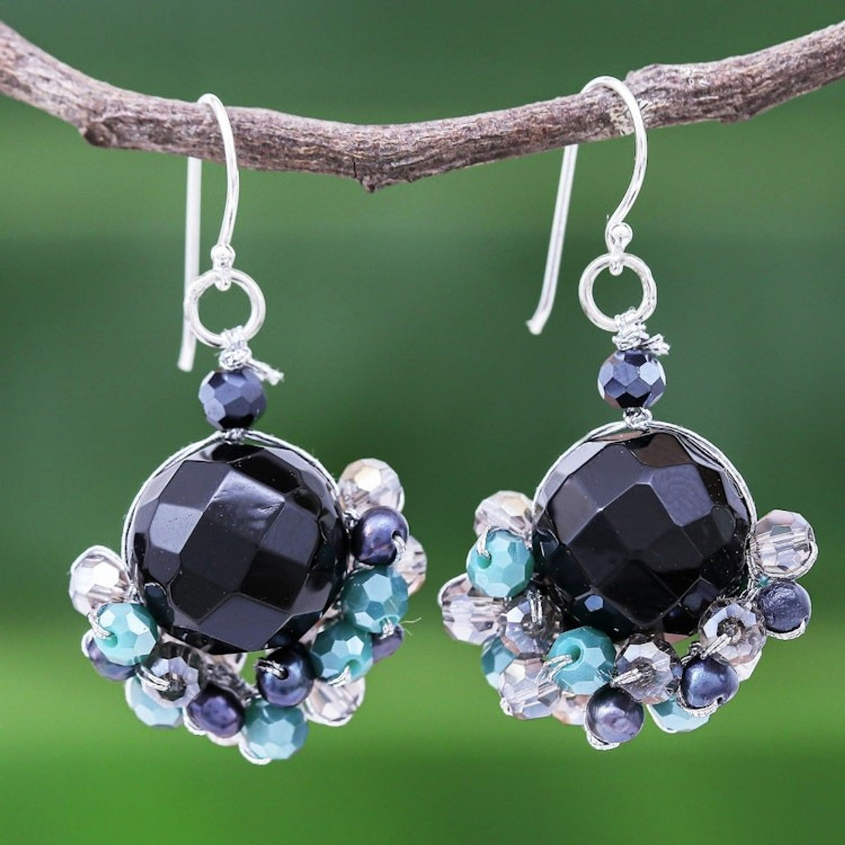 This Onyx and Freshwater Pearl Dangle Earrings 'Vivid Dream in Teal' is a vivid and elegant accessory. Designed by Nareerat, these dangle earrings feature round faceted onyx beads accented by a cluster of cultured freshwater pearls interspersed with glass beads. The piece, which is a celebration of skill and heritage, is a beautiful representation of the artisan's commitment to preserving handmade craft for future generations.