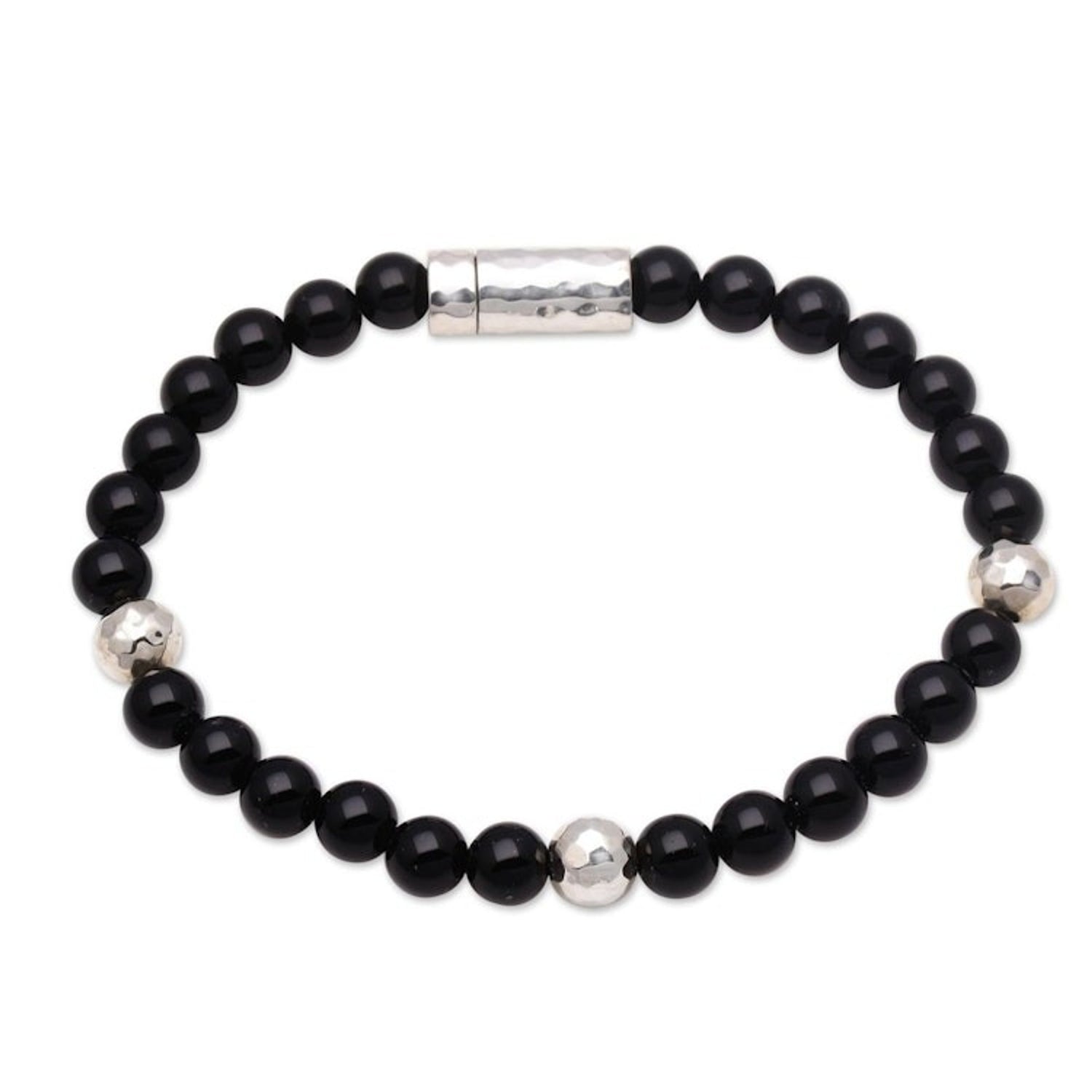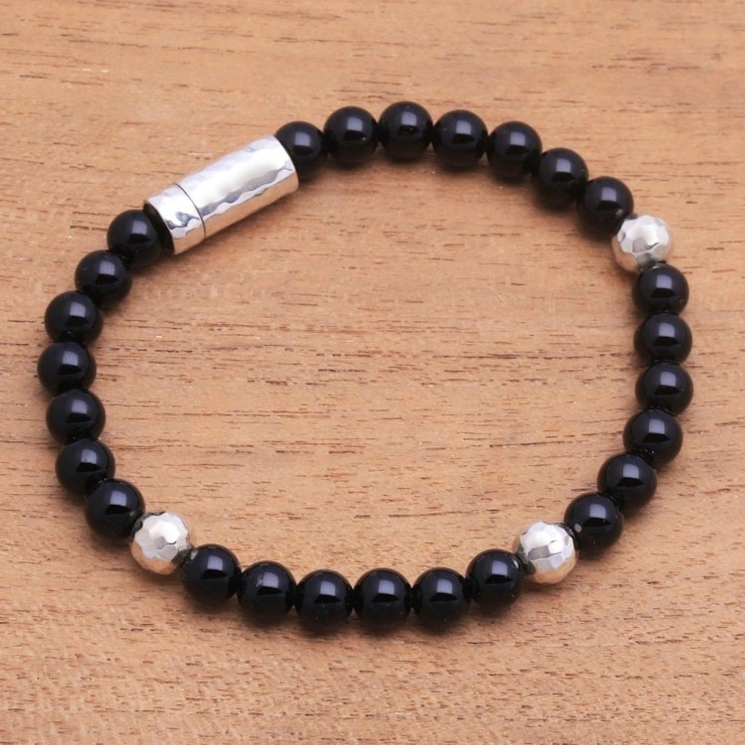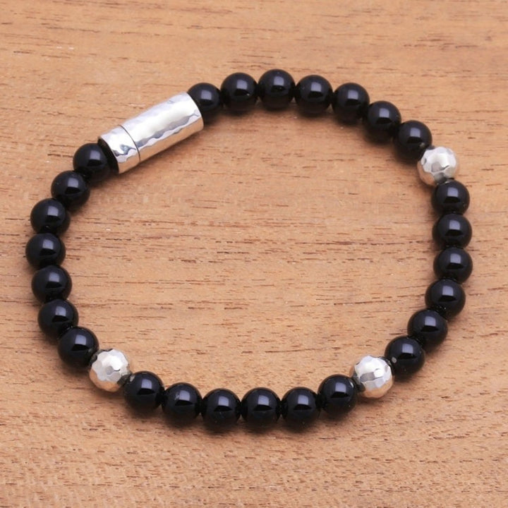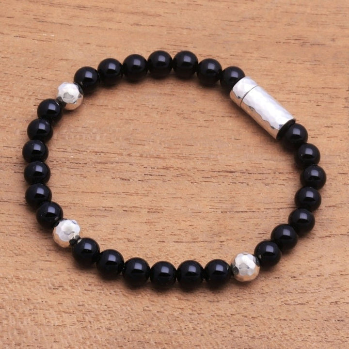Onyx and Hammered Silver Beaded Bracelet from Bali 'Hammered Beauty'