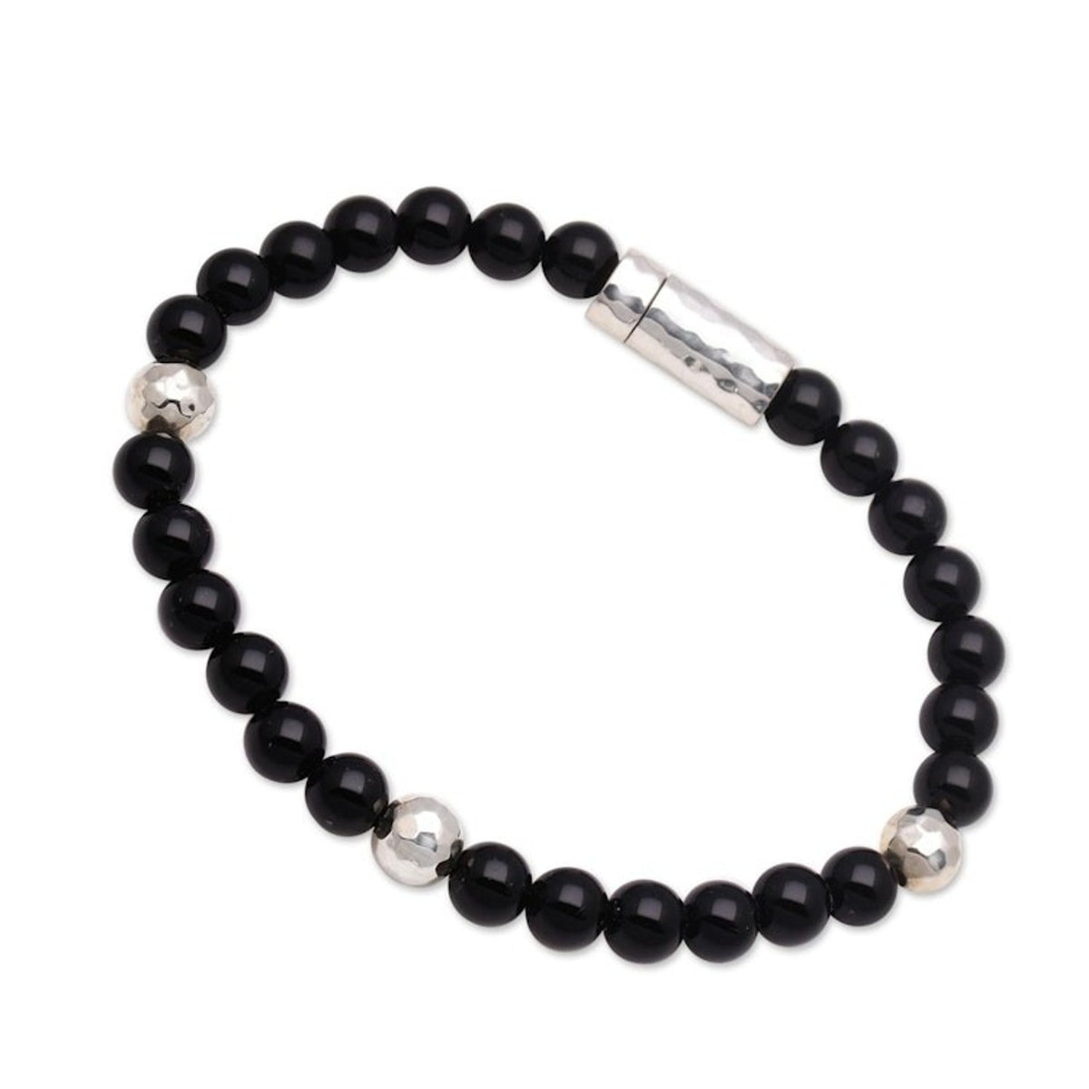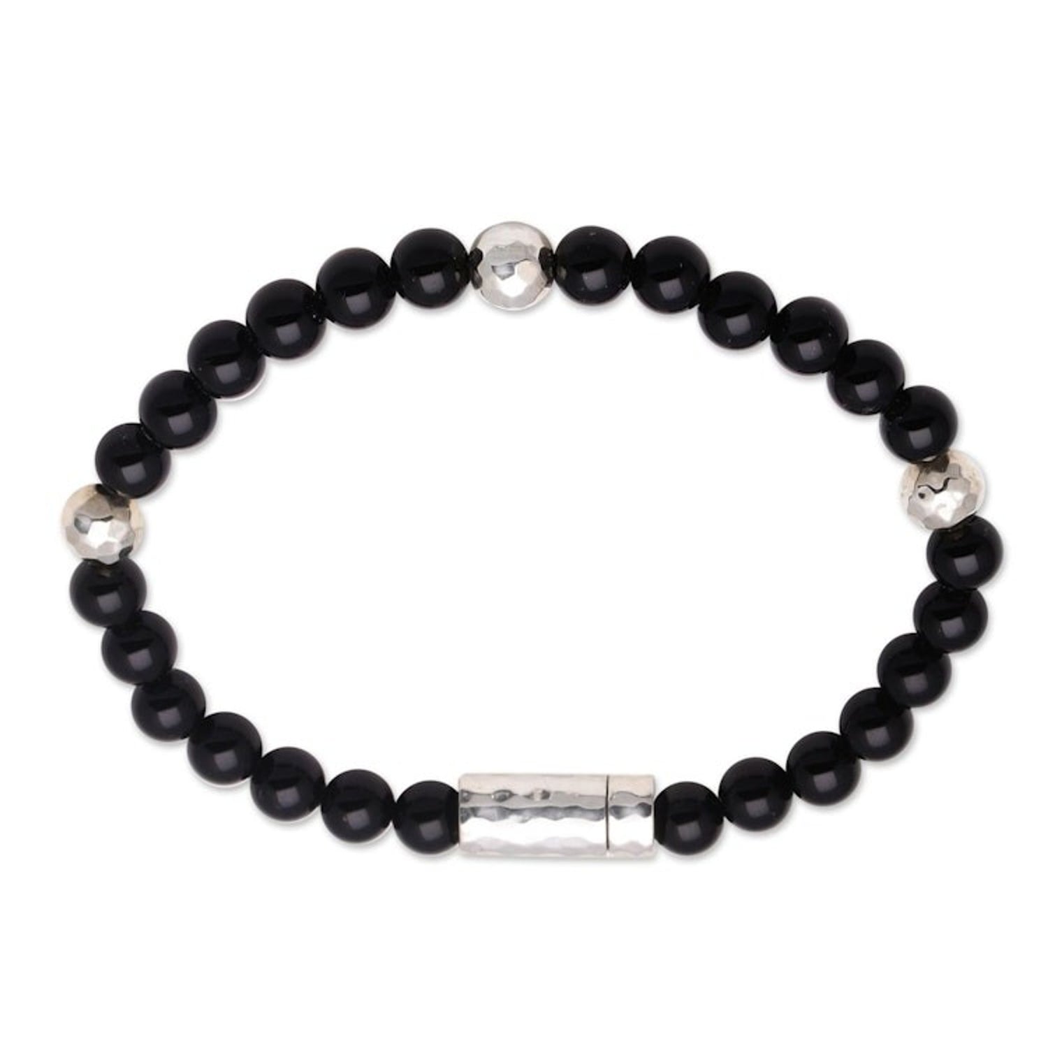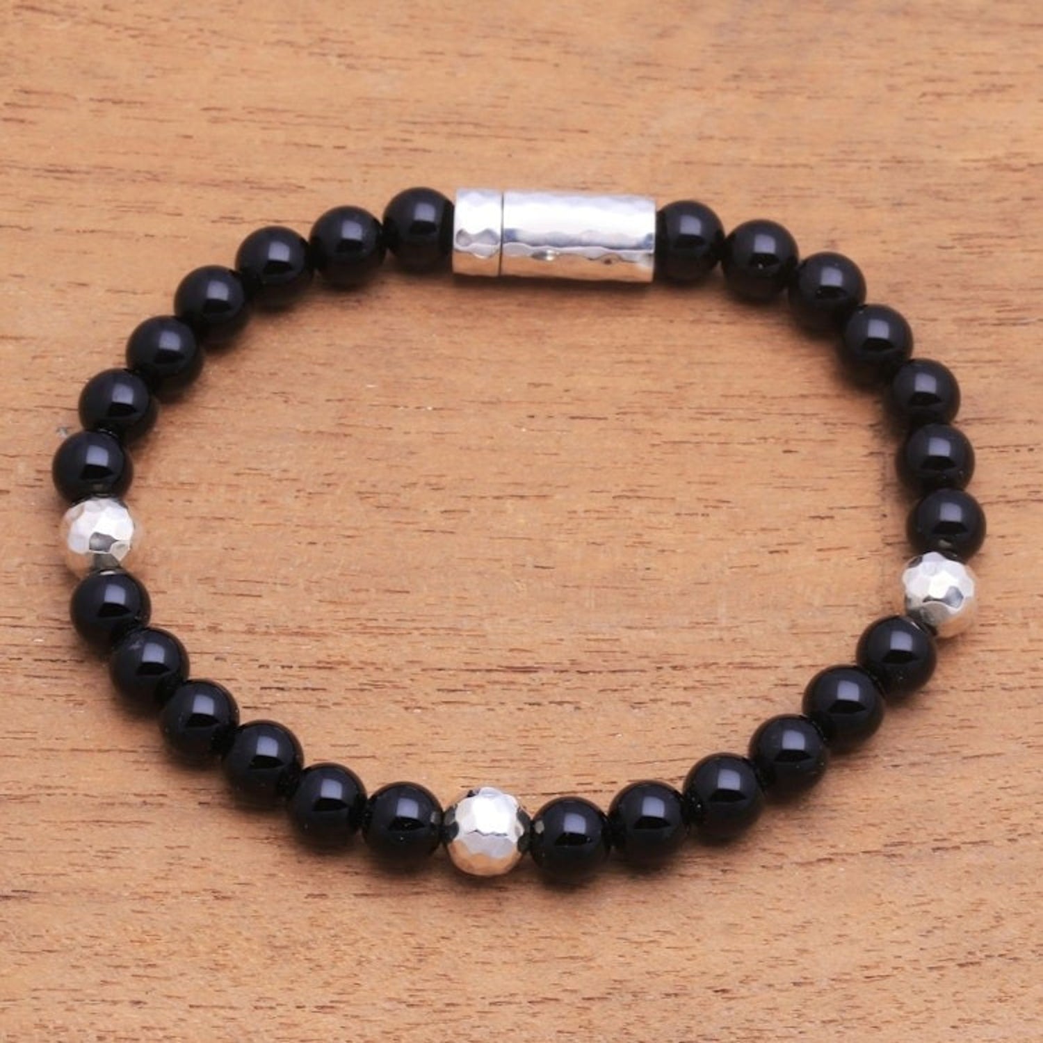 Onyx and Hammered Silver Beaded Bracelet from Bali 'Hammered Beauty'