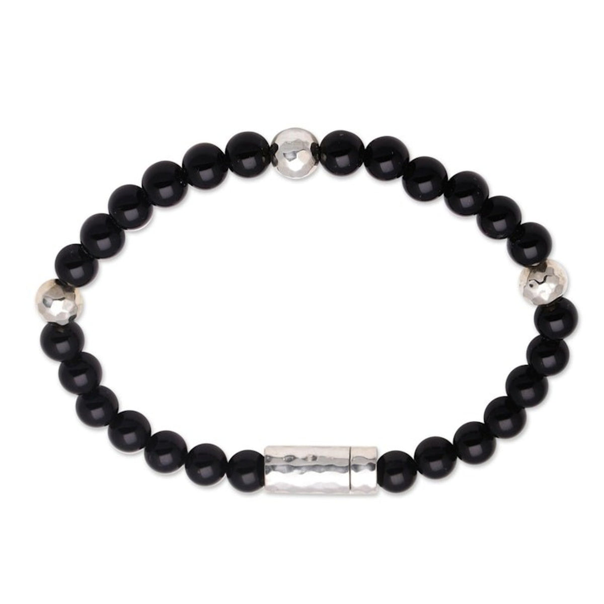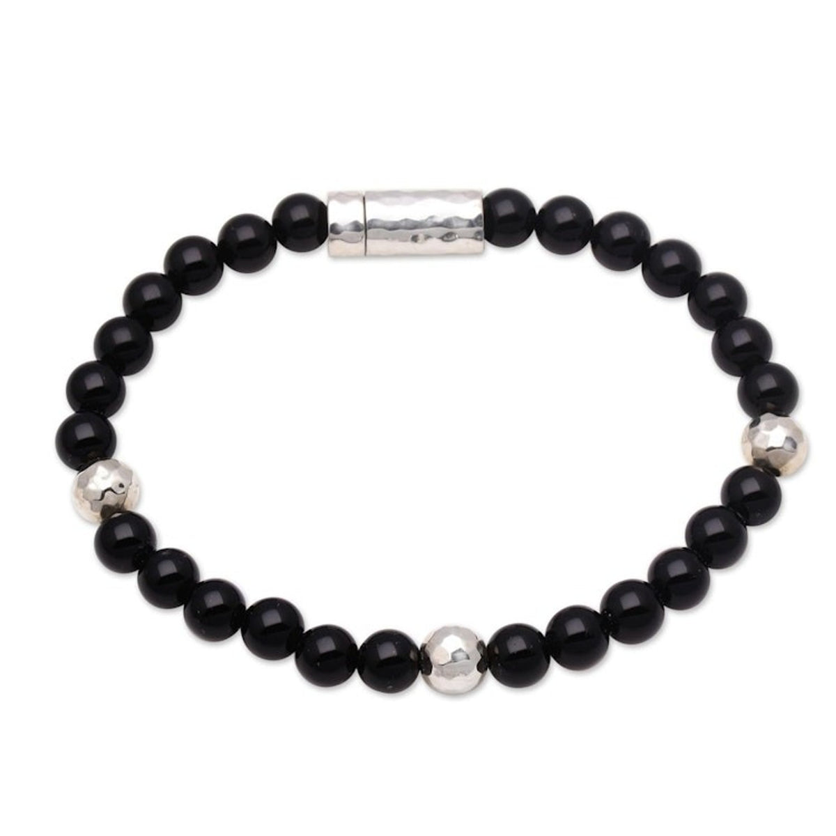 This Onyx and Hammered Silver Beaded Bracelet from Bali 'Hammered Beauty' is a beautiful and contemporary accessory. Designed by Nyoman Ariawan, this beaded bracelet intersperses deep black onyx beads with beads of hammered sterling silver. The piece, which connects heritage with contemporary design, is a beautiful representation of the artisan's commitment to empowering disadvantaged communities through craft.