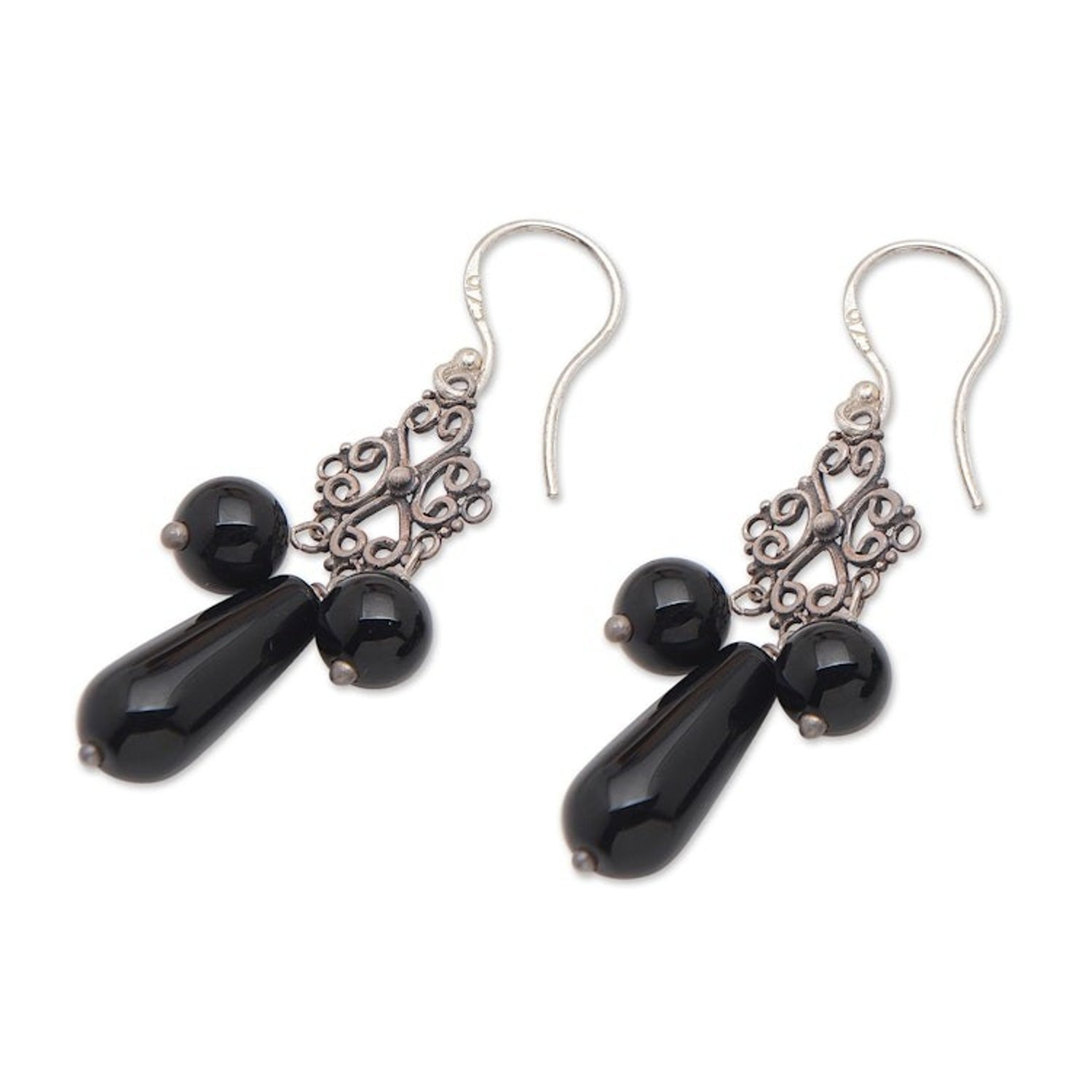 This Onyx and Sterling Silver Chandelier Earrings from Indonesia 'Black Droplets' is a sophisticated and charming accessory. Designed by Made Sugi, these sterling silver chandelier earrings feature elegant openwork spiral designs with three baubles of black onyx dangling from each. The piece, which embodies Balinese culture and artistry, is a beautiful representation of the artisan's motto to "never give up."