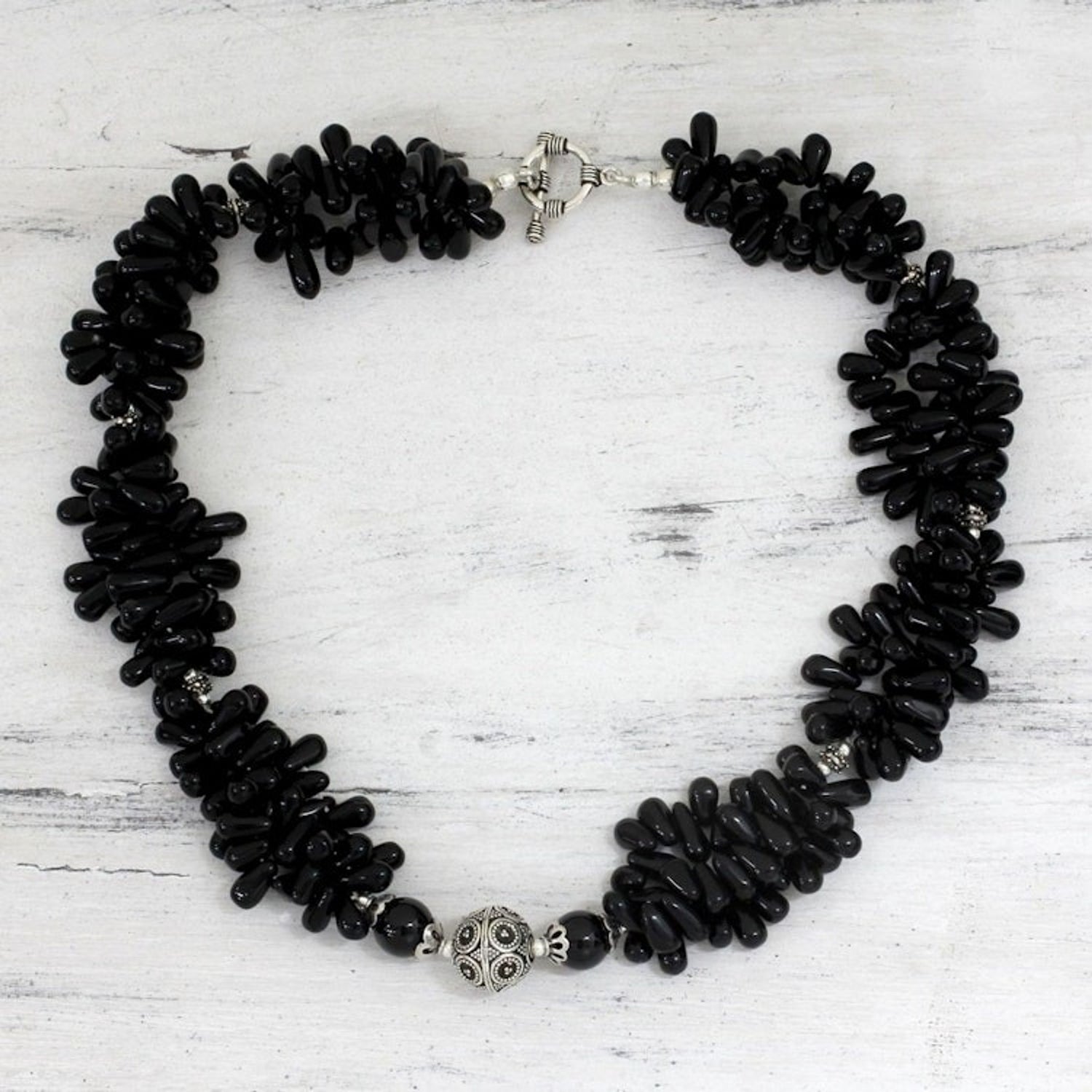 Handcrafted in India with .925 sterling silver and onyx. The necklace is 18 inches long and 0.8 inches wide. It has a combination finish.