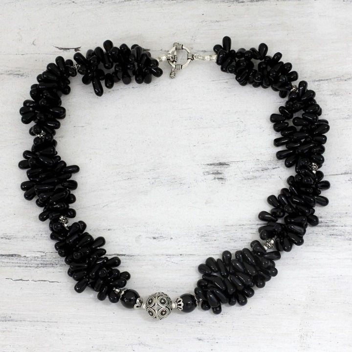 This Onyx cluster necklace 'Radiant Night' is a bold and elegant accessory. Designed by Narayannii, this necklace features polished teardrops of sleek black onyx clustered in an opulent strand with an ornate silver globe. The piece, which reflects both heritage and discovery, is a beautiful representation of the artisan's belief that it is never too late to uncover one’s true passions.