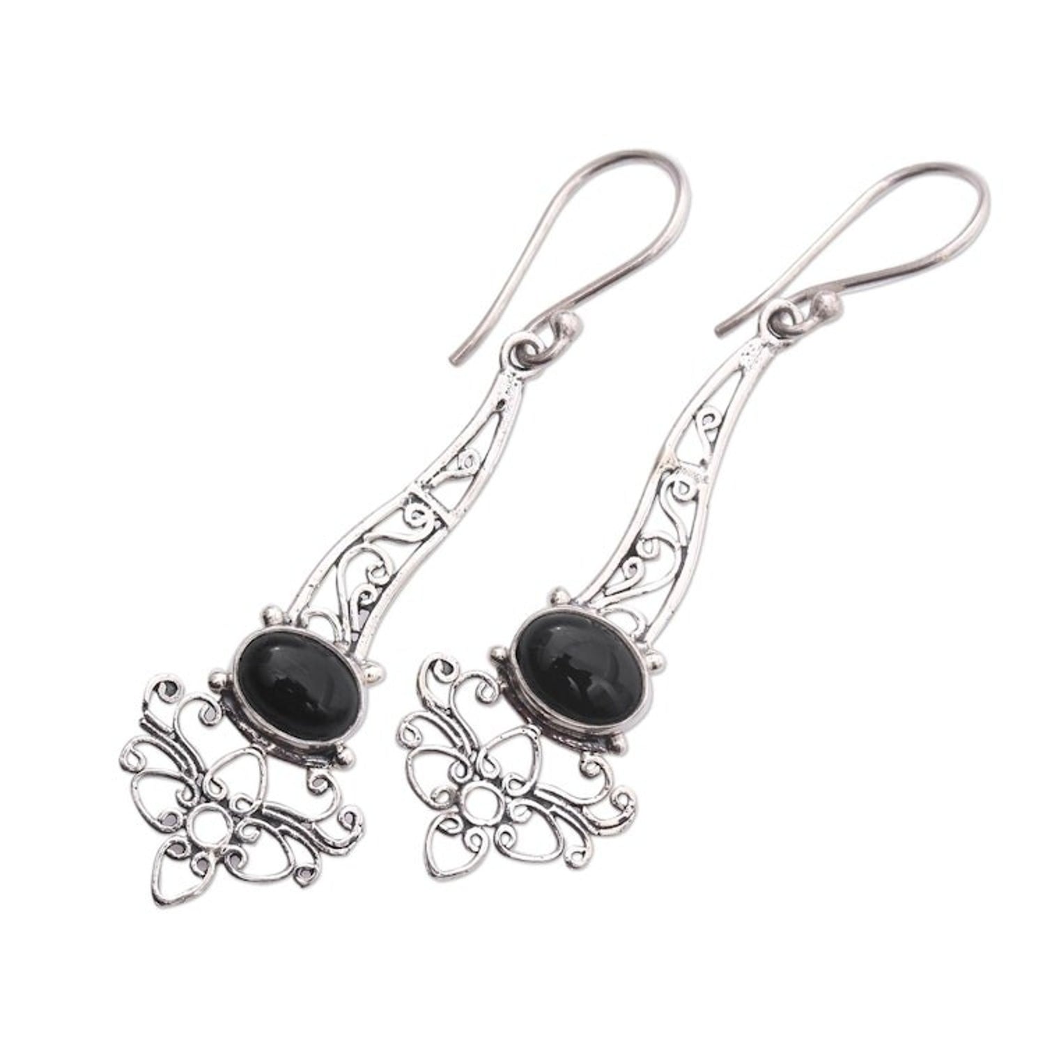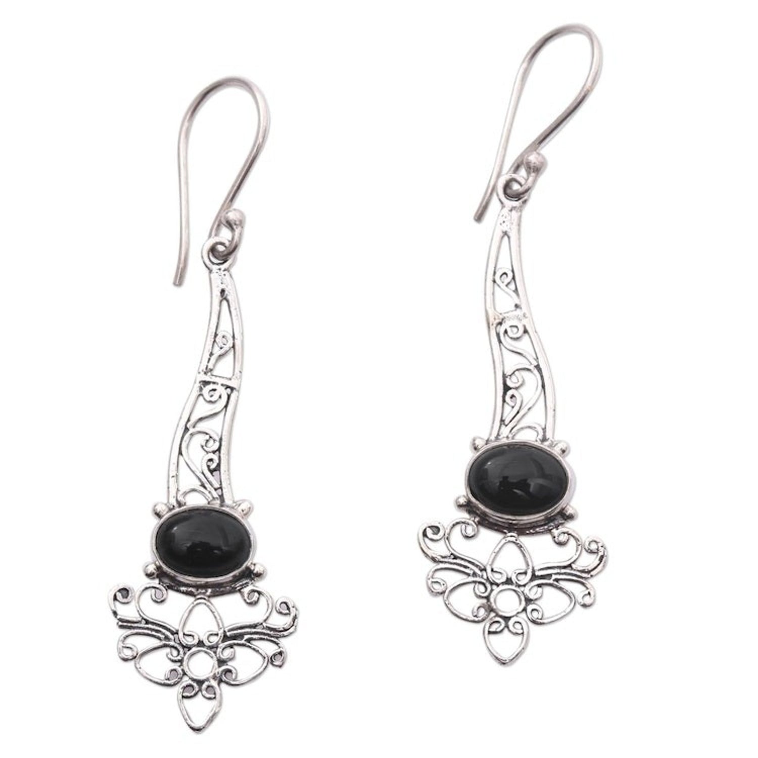 Onyx Sterling Silver Floral Motif Scrollwork Dangle Earrings 'Midnight Garden Breeze'