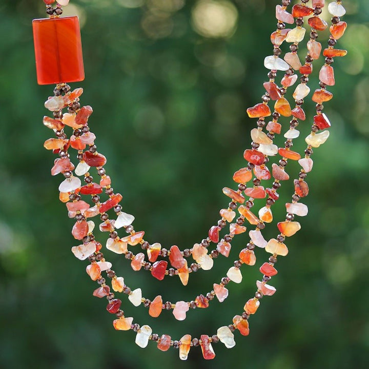 This Orange Carnelian and Chalcedony Strand Necklace 'Window to Courage' is a stunning and sublime accessory. Designed by Nareerat, this strand necklace features carnelian, chalcedony, and glass beads with warm orange hues and a geometric jewel. The piece, which is a celebration of skill and community empowerment, is a beautiful representation of the artisan's mission to keep the art of handmade jewelry alive.