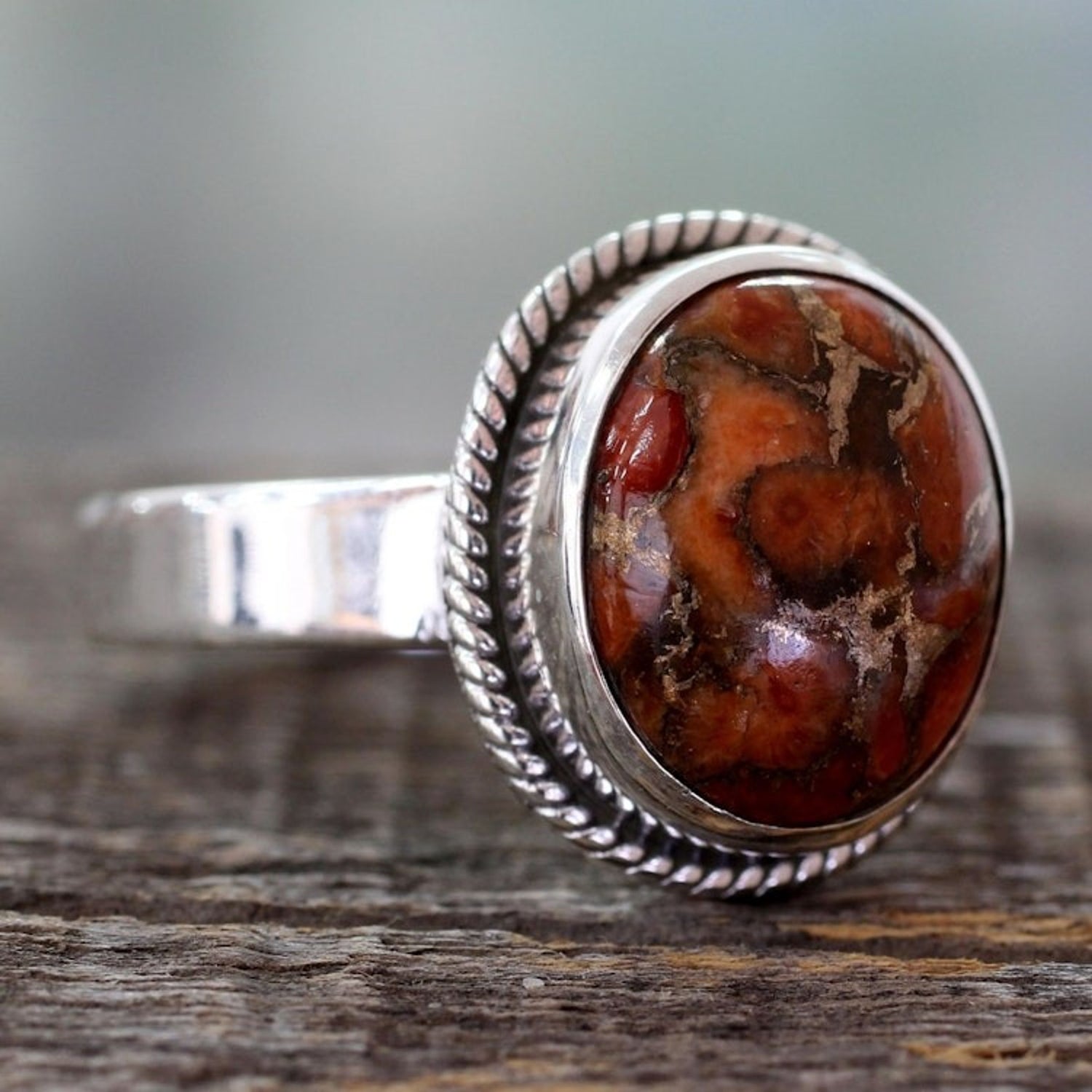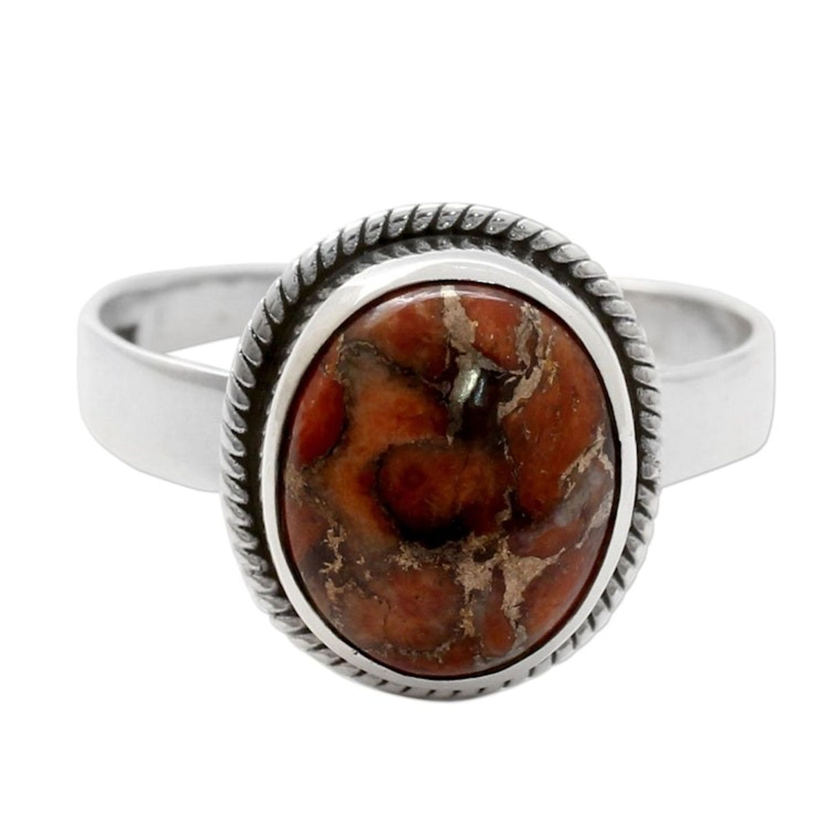 This Orange Composite Turquoise Silver Ring from India 'Sunset Sky in Jaipur' is a fascinating and beautiful accessory. Designed by Aparna, this sterling silver ring showcases composite turquoise in sunset tones of brown, red, and orange, surrounded by a single rope of sterling silver. The piece, which blends traditional artistry with contemporary forms, is a beautiful representation of the artisan's commitment to carrying forward her family's creative spirit.