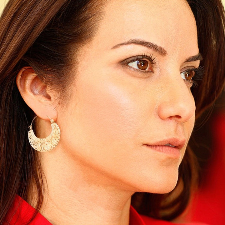 Handcrafted in Indonesia with 22k gold-plated .925 sterling silver. The earrings are 1.6 inches in length and 1.4 inches in width. They have a high-polish finish.