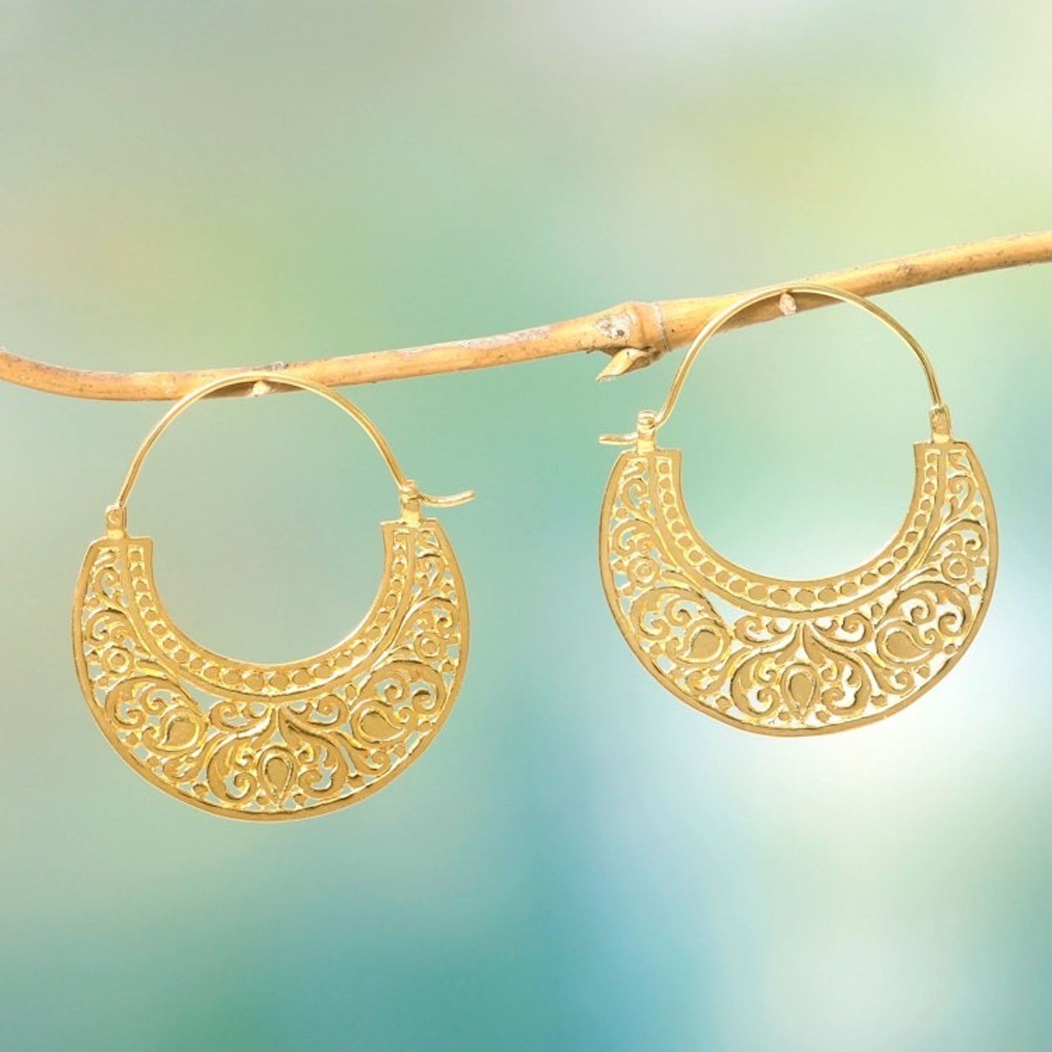 This Ornate 22k Gold Vermeil Hoop Earrings from Indonesia 'Garden of Eden' is a unique and gleaming accessory. Designed by Nyoman Rena, these hoop earrings are crafted from 22k gold vermeil with ornate openwork amid stylized vines and leaves and feature 'jawan' motifs. The piece, which captures Balinese heritage and contemporary design, is a beautiful representation of the artisan's commitment to nurturing his team and sharing his art.