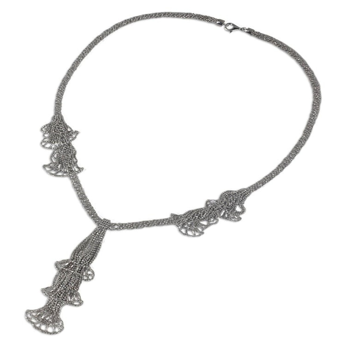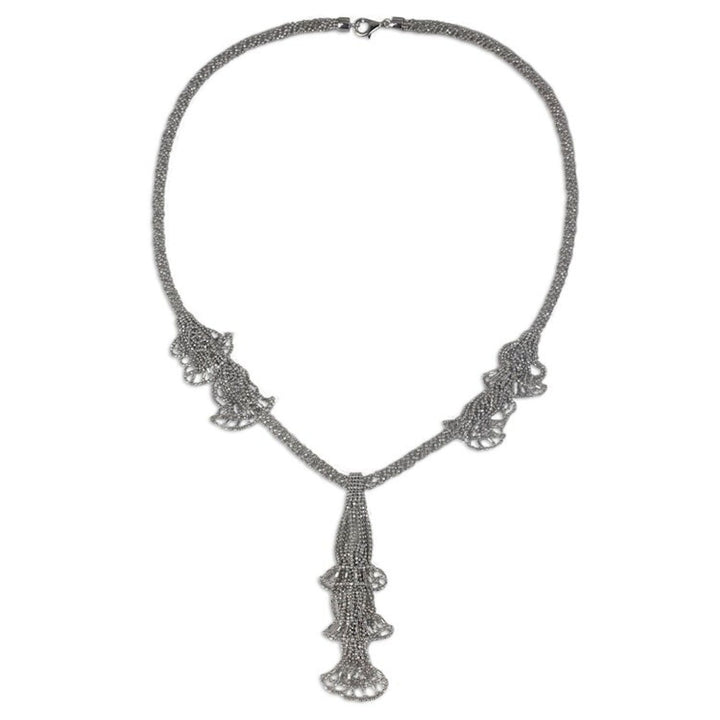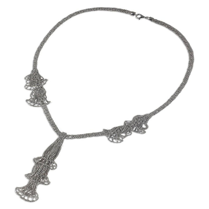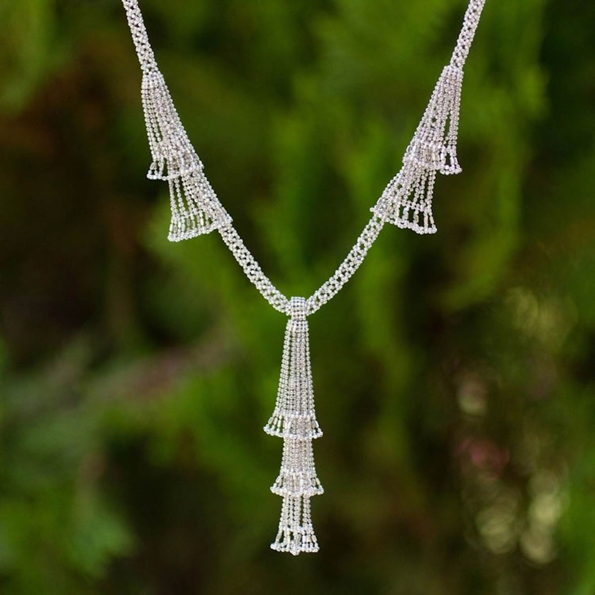 This Ornate Sterling Silver 925 Ball Chain Y Necklace 'Regal Cascade' is a dramatic and luxurious accessory. Designed by Angels, this sterling silver Y necklace features woven chains that culminate in a pendant with waterfall-like tiers, sparkling like a crystal chandelier. The piece, which embodies tradition and refinement, is a beautiful representation of the artisan's commitment to continuing the family legacy.