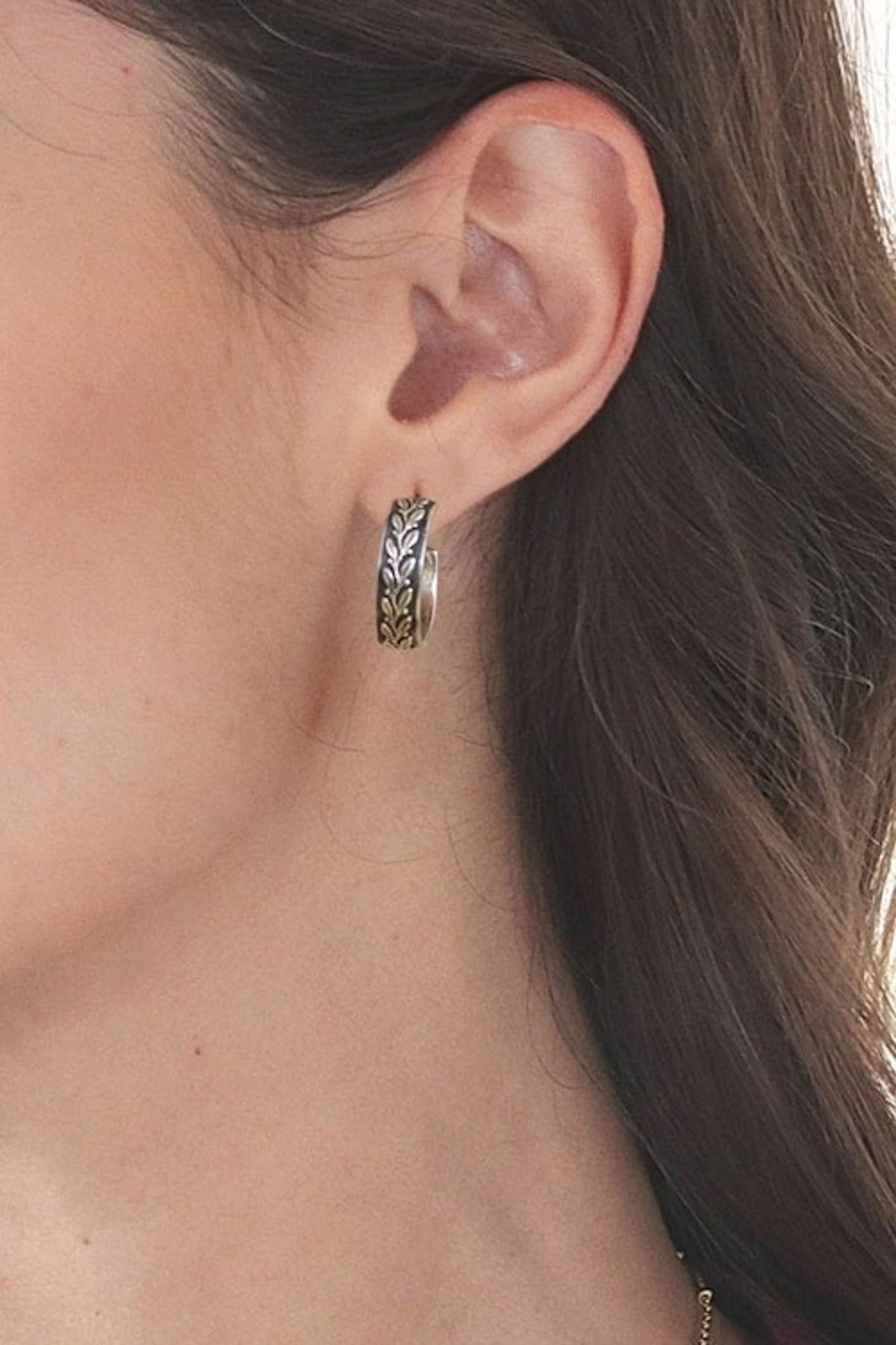 These Oxidized Leafy Embossed Taxco Silver Half-Hoop Earrings 'Ode to Nature' are a classic and magnificent accessory. Designed by Alon Diller, these half-hoop earrings are crafted from 950 silver with embossed laurel leaves and a combination of oxidized and polished finishes. The piece, which is a renewal of tradition, is a beautiful representation of the artisan's belief that jewelry is both art and storytelling.