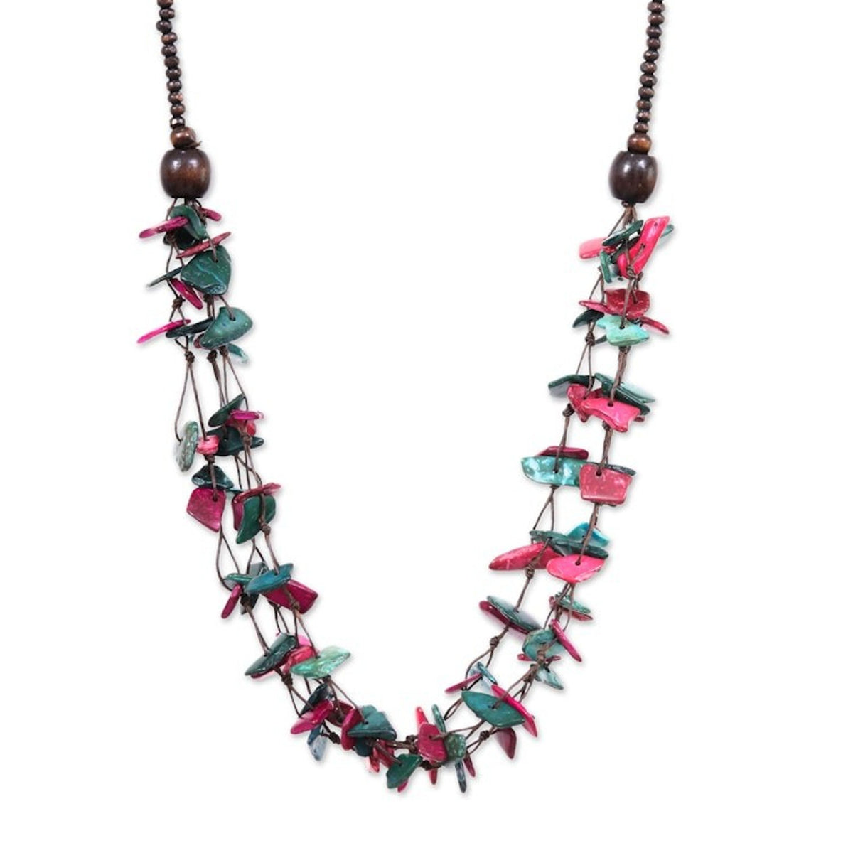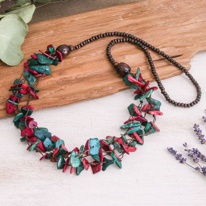 This Painted Turquoise and Fuchsia Beaded Three-Strand Necklace 'Fragments of Fantasy' is a bohemian and dreamy accessory. Designed by Sumalee Nawakul, this three-strand necklace is made from petite coconut shell pieces in turquoise and fuchsia hues and little leaf wood beads. The piece, which is a celebration of Thai craftsmanship, is a beautiful representation of the artisan's commitment to uplifting others through her work.