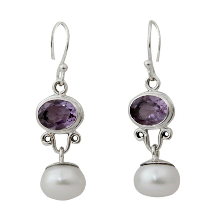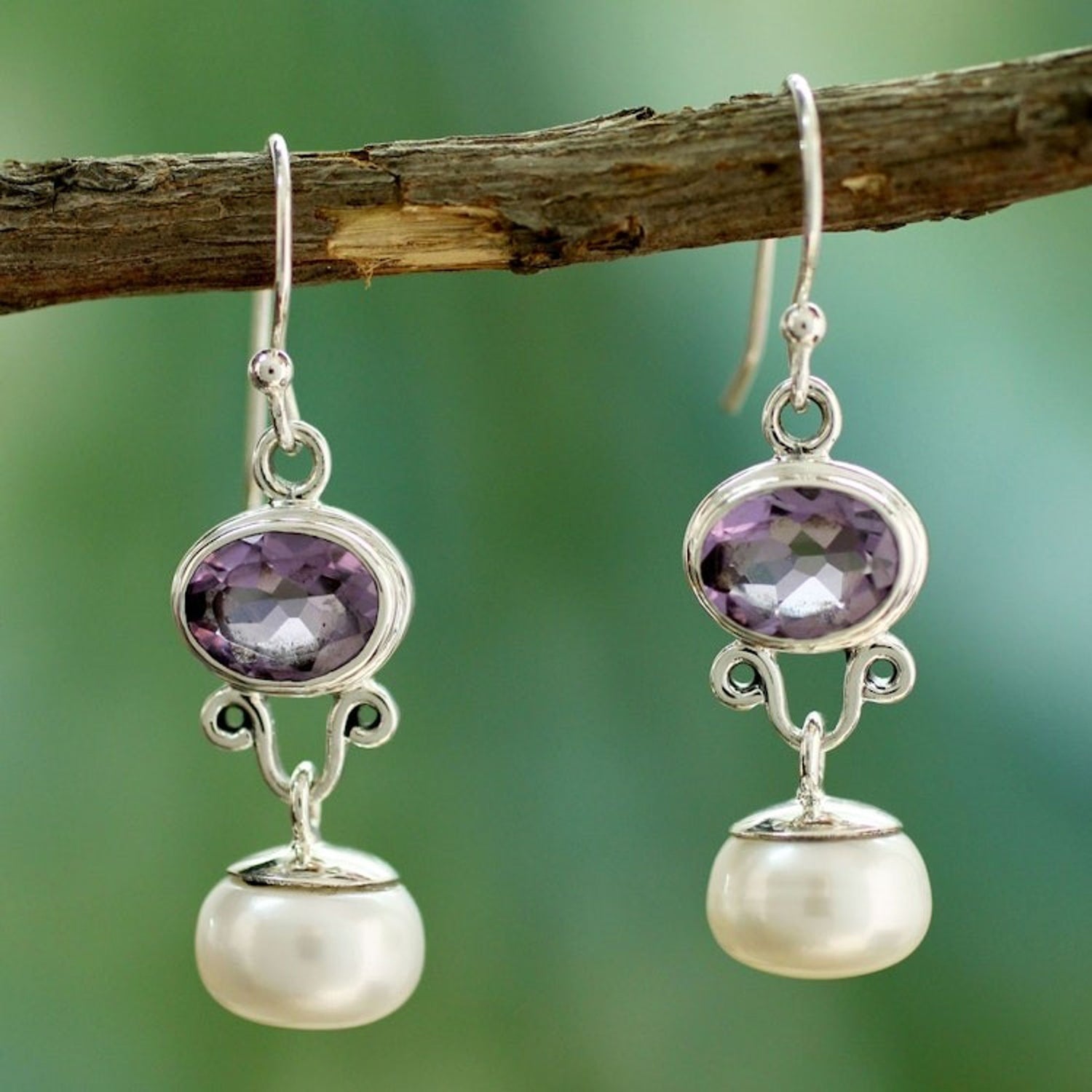 Pearl and Amethyst Dangle Earrings 'Dazzling Delhi' These 'Dazzling Delhi' dangle earrings by Independent Artisans are a captivating fusion of vibrant color and classic elegance. Crafted by Indian designer Shanker, they pair dazzling amethysts with iridescent freshwater cultured pearls. The high-polish sterling silver settings enhance the luminosity of the stones, creating a piece that represents perseverance, tradition, and the enduring passion for craftsmanship. These elegant earrings are perfect for adding a touch of sophistication to any ensemble.