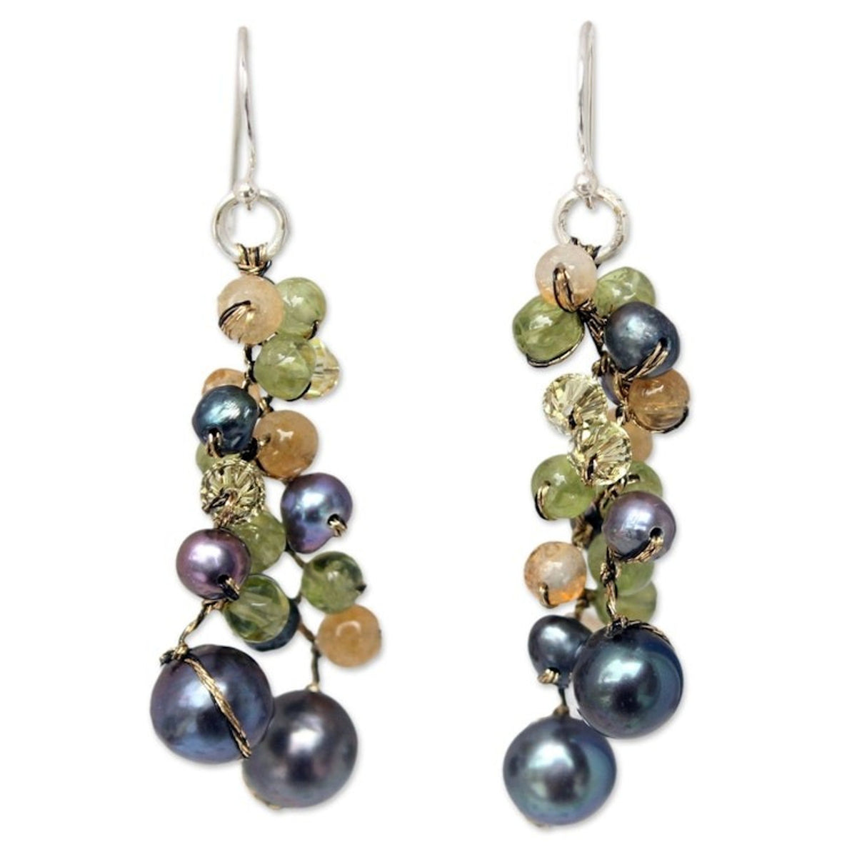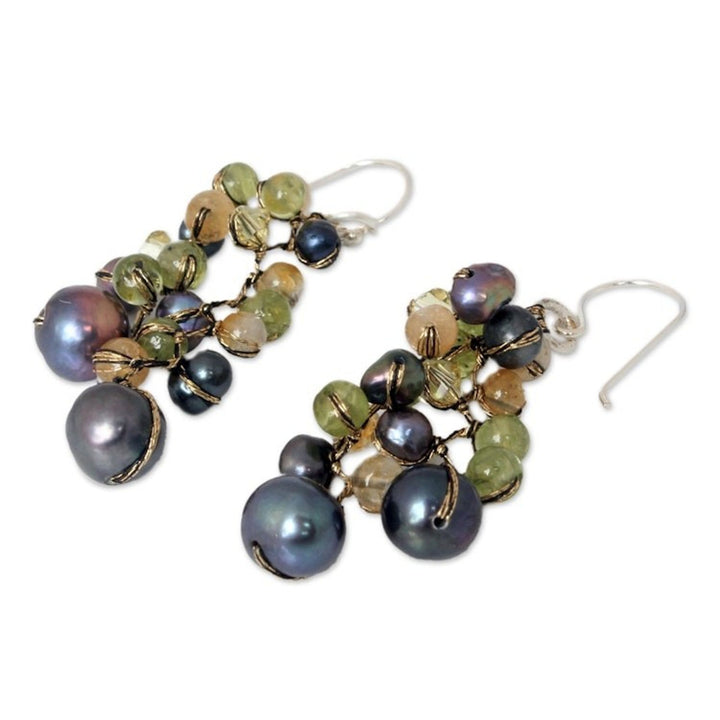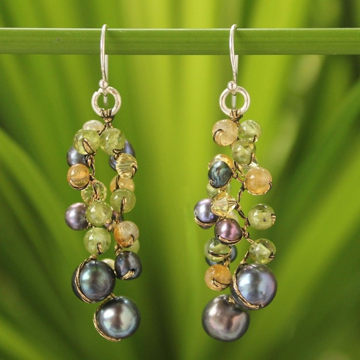Handcrafted in Thailand with dyed cultured freshwater pearls, peridot, citrine, glass, and silk threads. The earrings feature sterling silver hooks and silver-plated brass, measuring 2.2 inches L x 0.8 inches W.