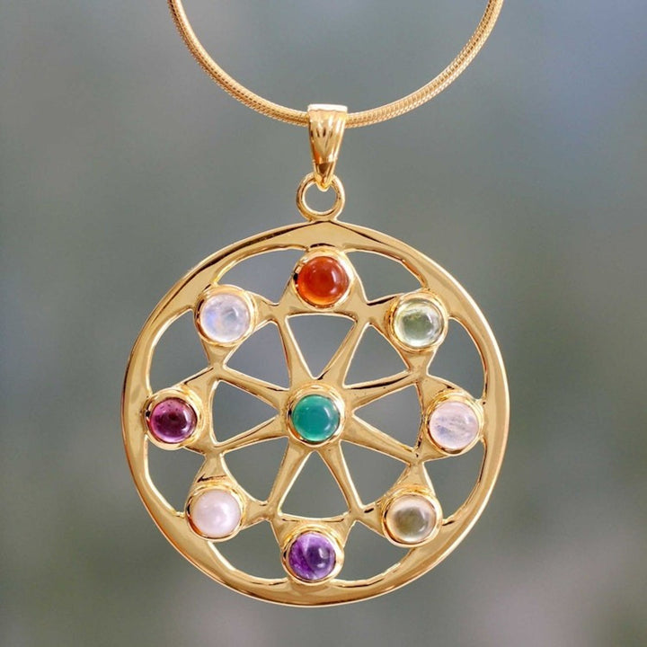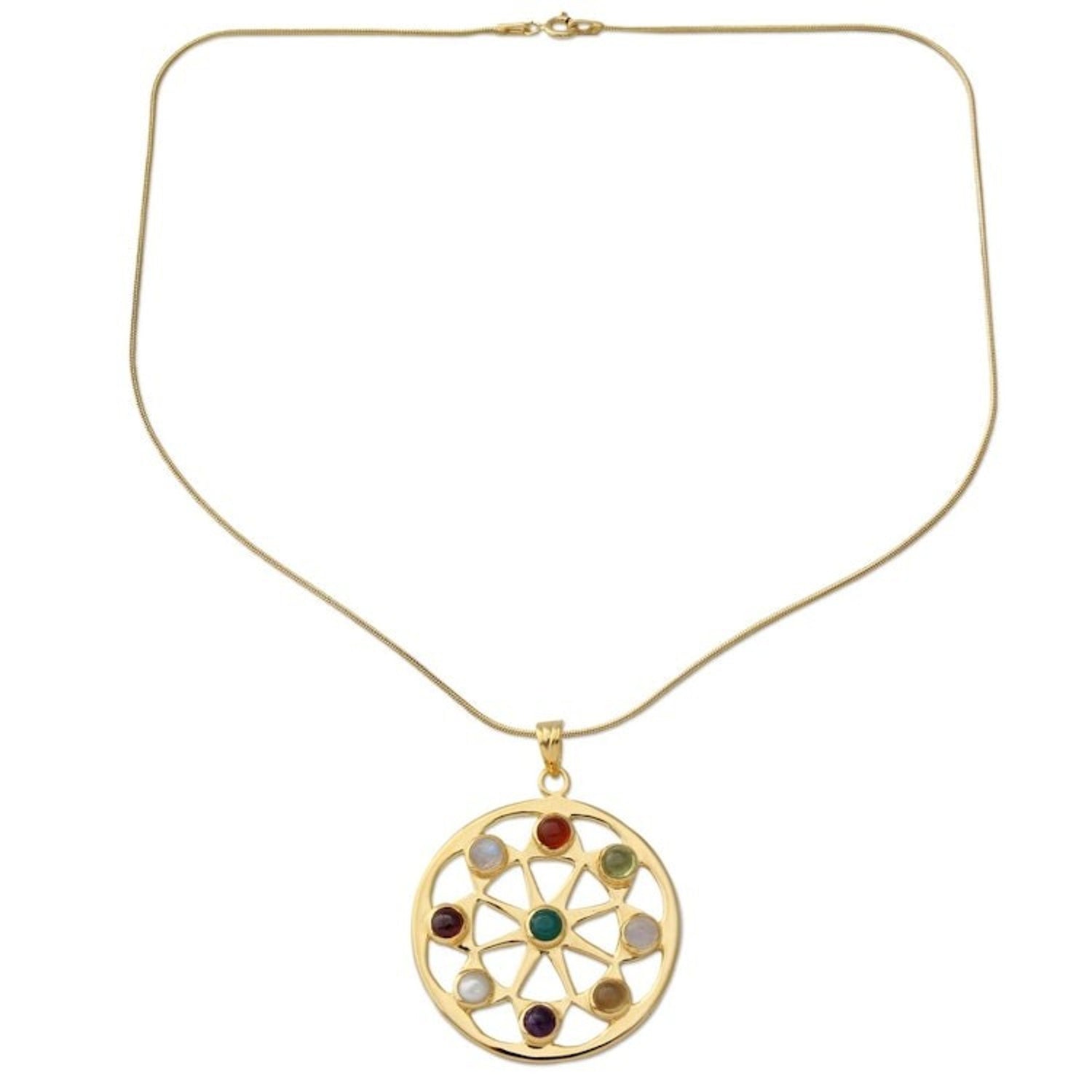 Pearl and Gemstones on Gold Vermeil Necklace 'Indian Sun' This 'Indian Sun' vermeil necklace by Independent Artisans is as bright and captivating as its name suggests. Created by a designer from Jaipur, a city known for its vibrant jewelry traditions, this necklace features a beautiful golden star pendant adorned with a colorful array of stones, including garnet, amethyst, pearl, carnelian, peridot, citrine, heat-treated green onyx, and moonstone. The intricate pendant and delicate chain are crafted from 22k gold-plated sterling silver, making this a piece that balances timeless Indian artistry with modern appeal.