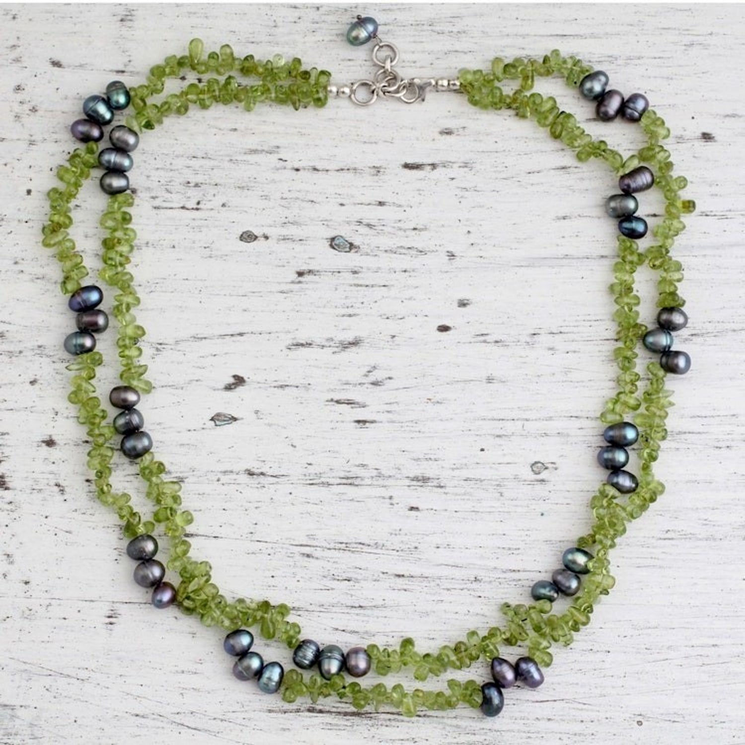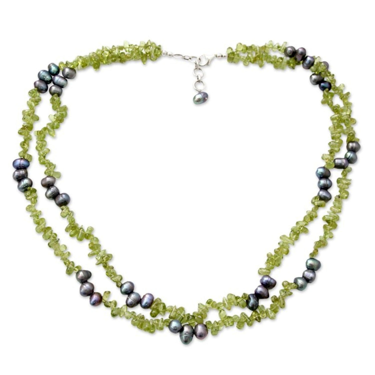 Pearl and peridot strand necklace 'Opulent Lime' This 'Opulent Lime' strand necklace by Independent Artisans is a lavish and elegant design by Indian artisan Narayani. Combining multiple strands of luminous, uncut peridot with the soft glow of iridescent gray pearls, this piece makes a bold yet sophisticated statement. The two lavish strands are beautifully linked with a sterling silver clasp, showcasing the quiet strength and graceful style that defines Narayani's work. This necklace is perfect for those who appreciate the raw, natural beauty of gemstones and the timeless art of a handcrafted piece.