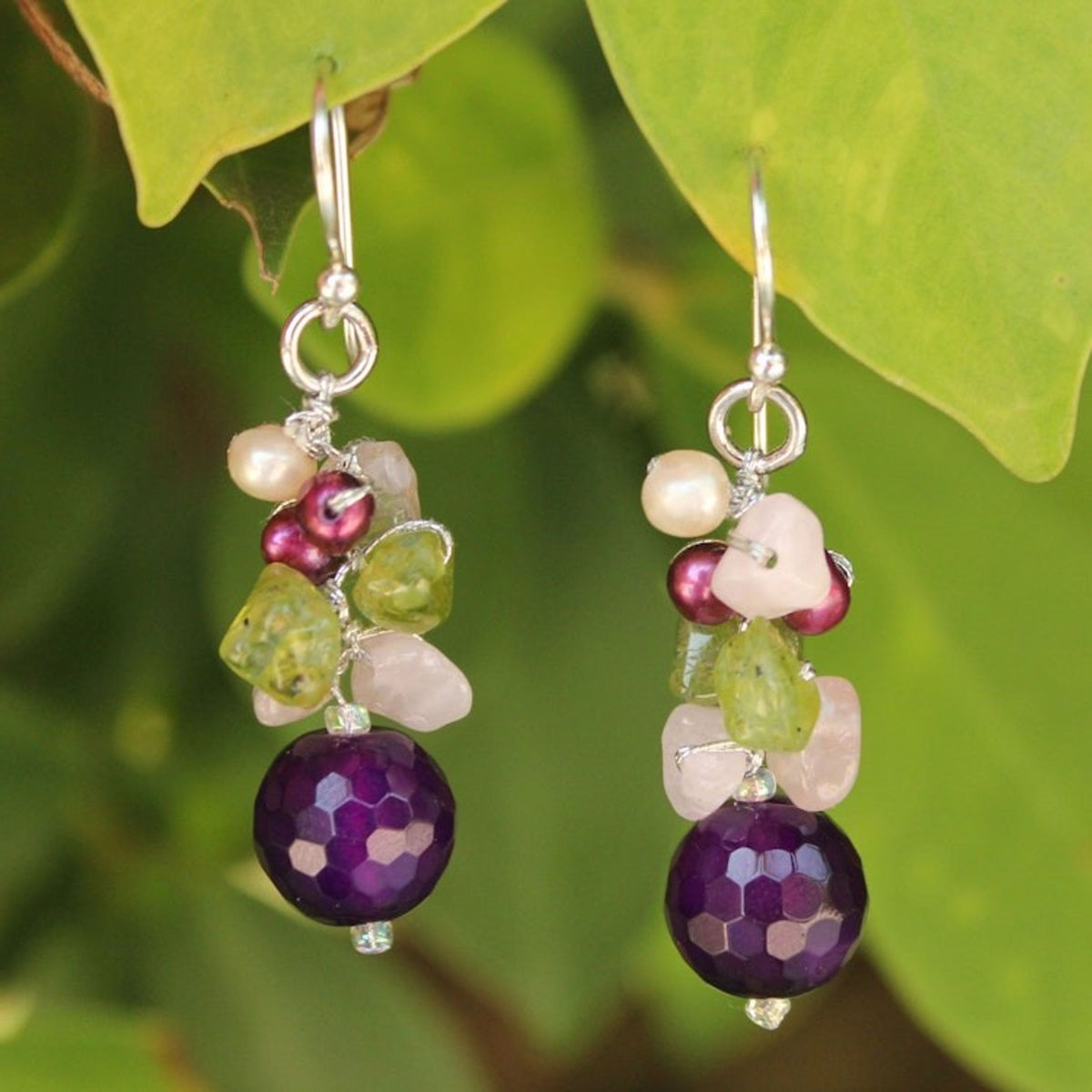 Pearl and Rose Quartz Cluster Earrings 'Princess Legend' These 'Princess Legend' cluster earrings by Independent Artisans are a radiant and artistic design by Thai artisan Nareerat. Exquisite gemstones, including dyed cultured pearls, purple quartz, rose quartz, and peridot, are meticulously knotted on silken strands. The delicate cluster hangs from sterling silver wires, creating a piece that feels both luxurious and ethereal. This design is a celebration of skill, heritage, and the determination to keep the art of handmade jewelry alive for future generations.