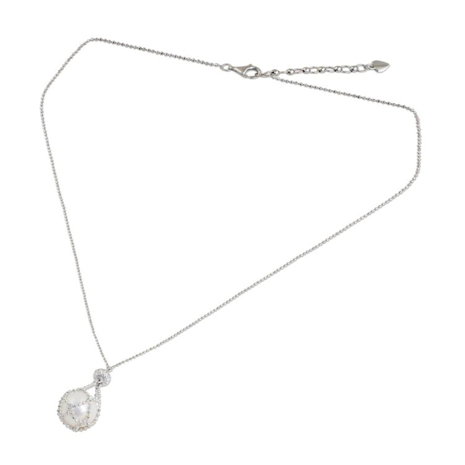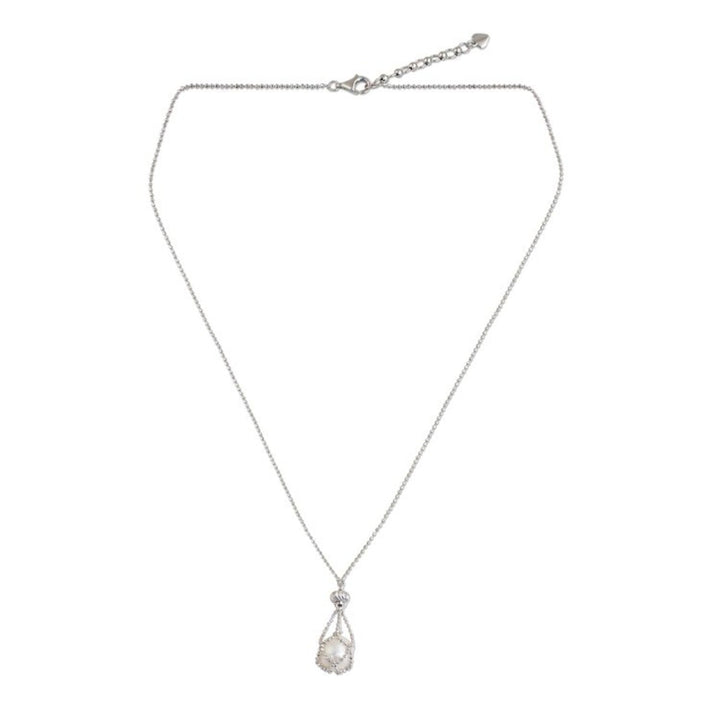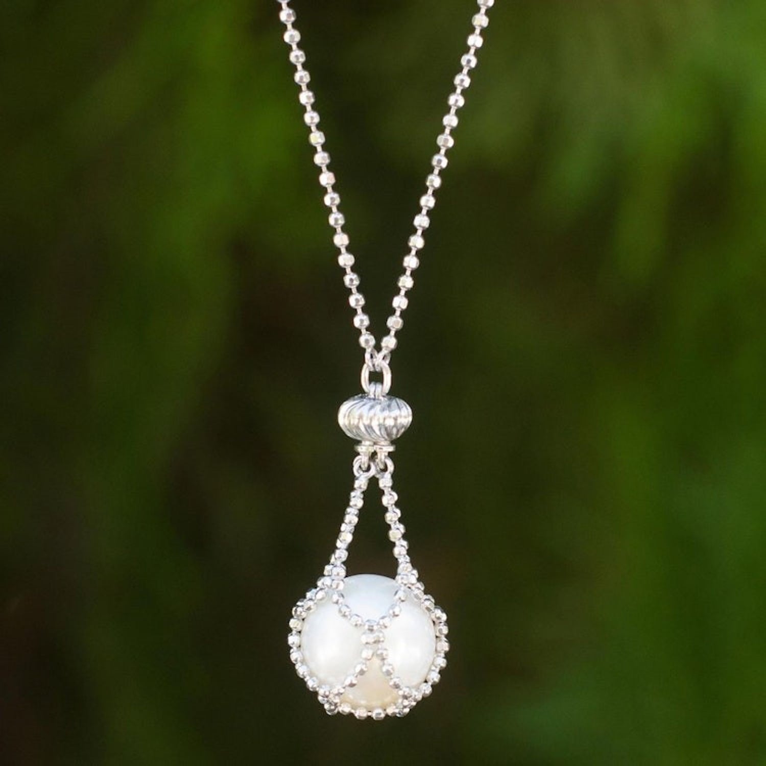 Pearl and Sterling Silver Hand Crafted Pendant Necklace 'Lily Dewdrop' This 'Lily Dewdrop' pendant necklace by Independent Artisans is a unique and graceful creation by Angels of Thailand. A luminous white cultured pearl, the June birthstone, is suspended within a delicate, silvery net. The intricate pendant is attached to a glistening sterling silver ball chain, which sways with graceful movement. This versatile necklace features an adjustable extender chain, embodying a blend of tradition and modern refinement. It is a piece that carries the legacy of a family dedicated to preserving Thailand’s silversmithing culture.