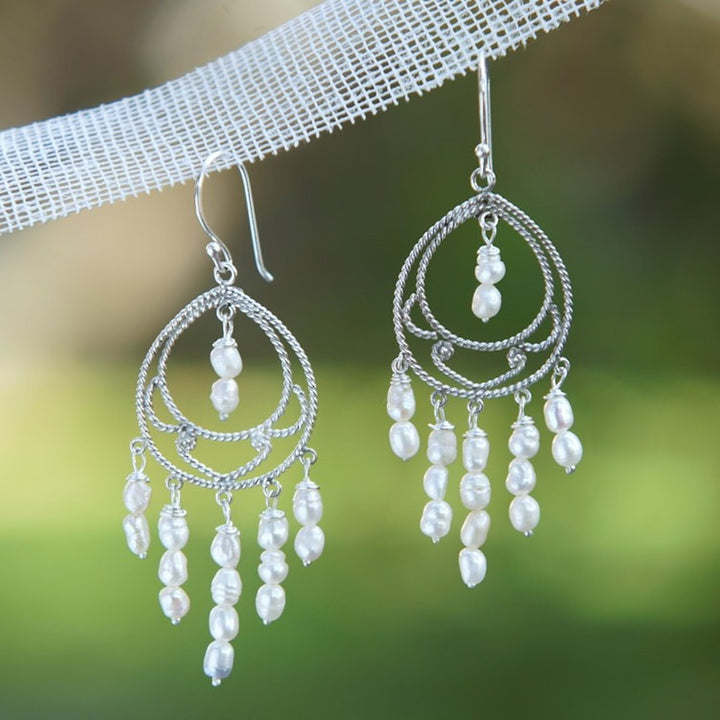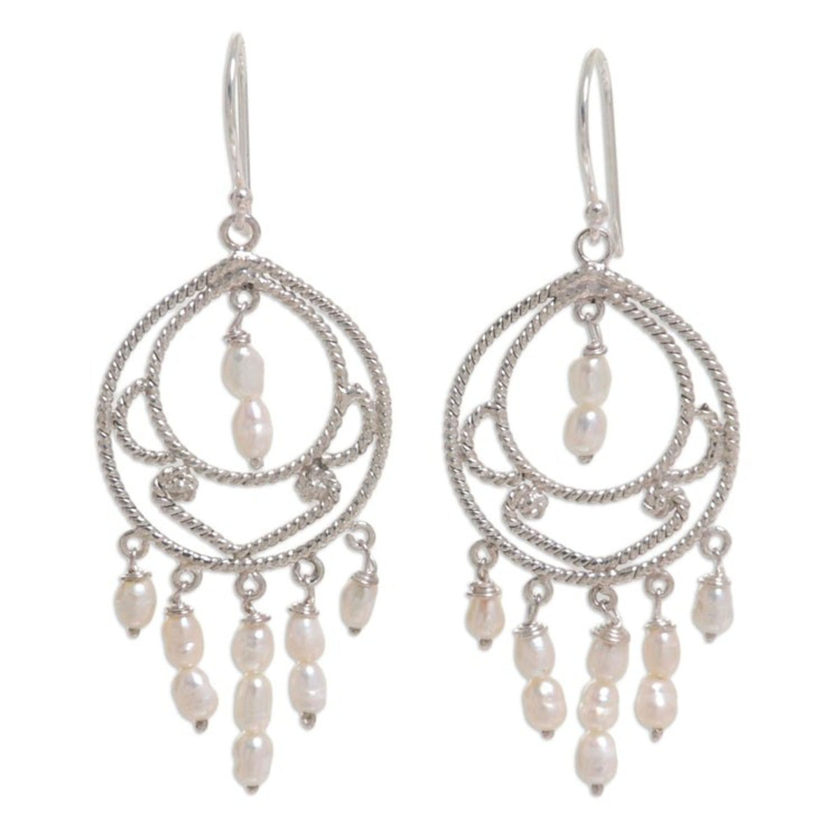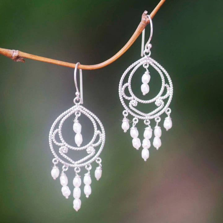 Pearl chandelier earrings 'Gracious Lady' These 'Gracious Lady' chandelier earrings by Independent Artisans exude an air of gracious refinement. Balinese artisan Nyoman Rena has handcrafted each earring by shaping spiral strands of sterling silver that are both fluid and intricate. Luminous white pearls are artfully placed within the design, adding their classic allure to the handcrafted piece. This jewelry is a perfect blend of Rena's unique carving skills and metalwork, capturing both Balinese heritage and contemporary fashion.