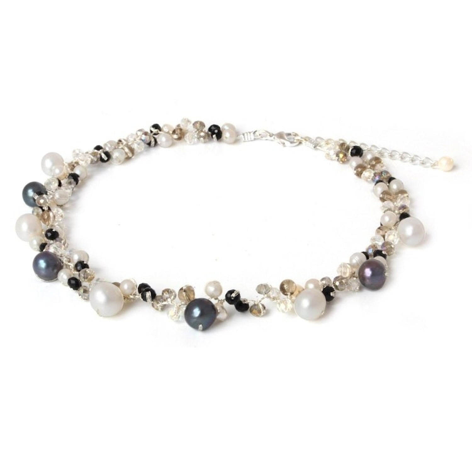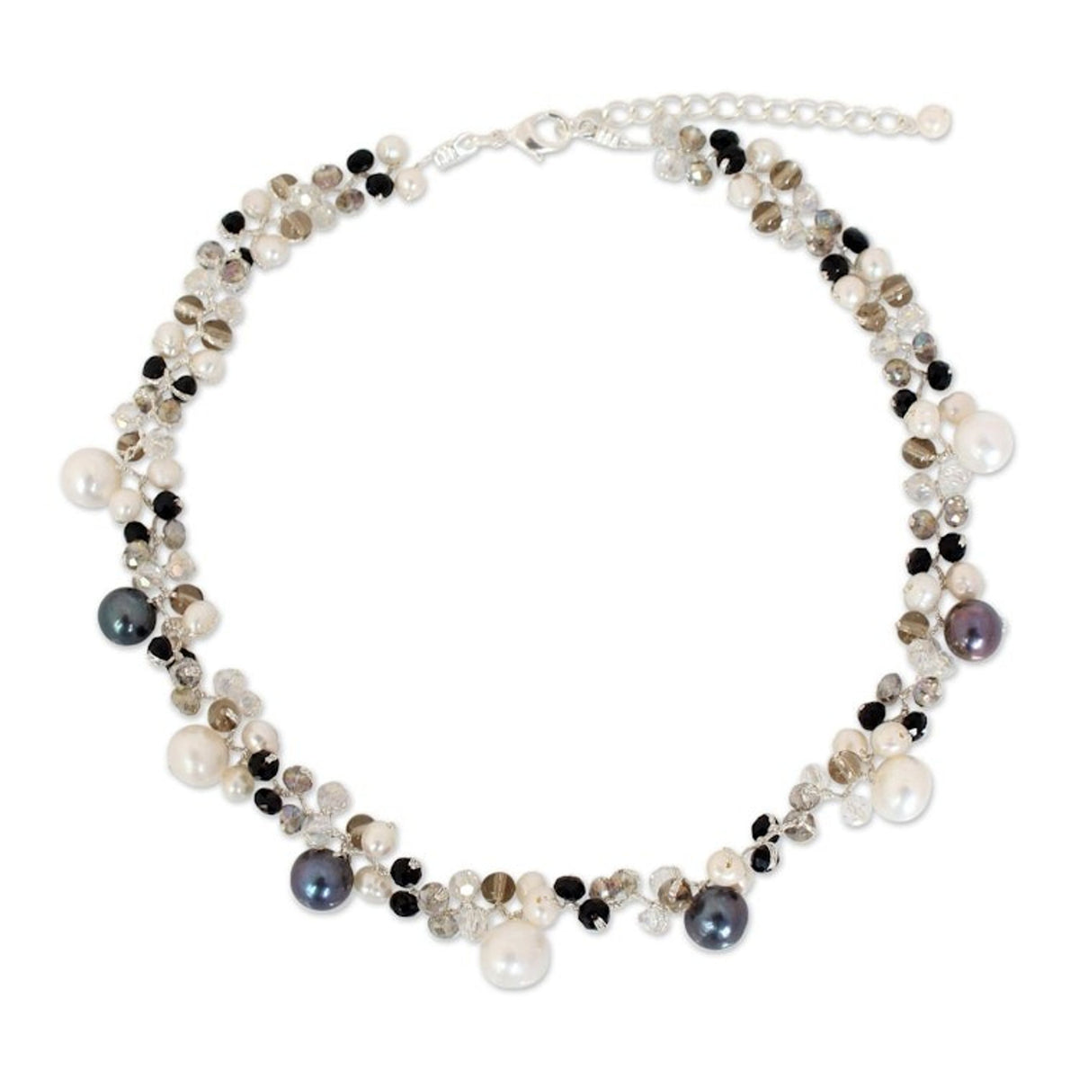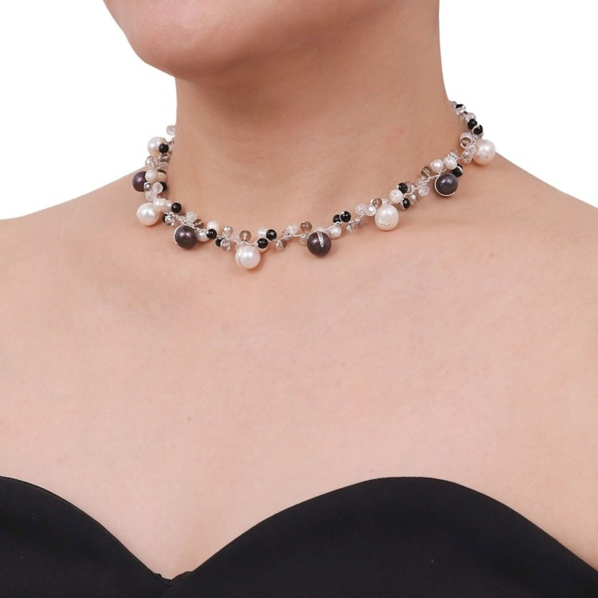 Pearl Choker Necklace 'A Spark of Romance' This 'A Spark of Romance' choker necklace by Independent Artisans sparkles with romantic elegance and a belief in the power of stones to bring positivity. Designed by Sasina Leerasawatdiampon, the choker is knotted by hand on silk core threads with a harmonious mix of luminous white and dyed gray pearls and faceted glass beads in clear, black, and smoky hues. The length is adjustable, with a sterling silver plated brass extender and clasp, making it perfect for layering or wearing on its own. Each piece is a beautiful blend of imagination and compassion.