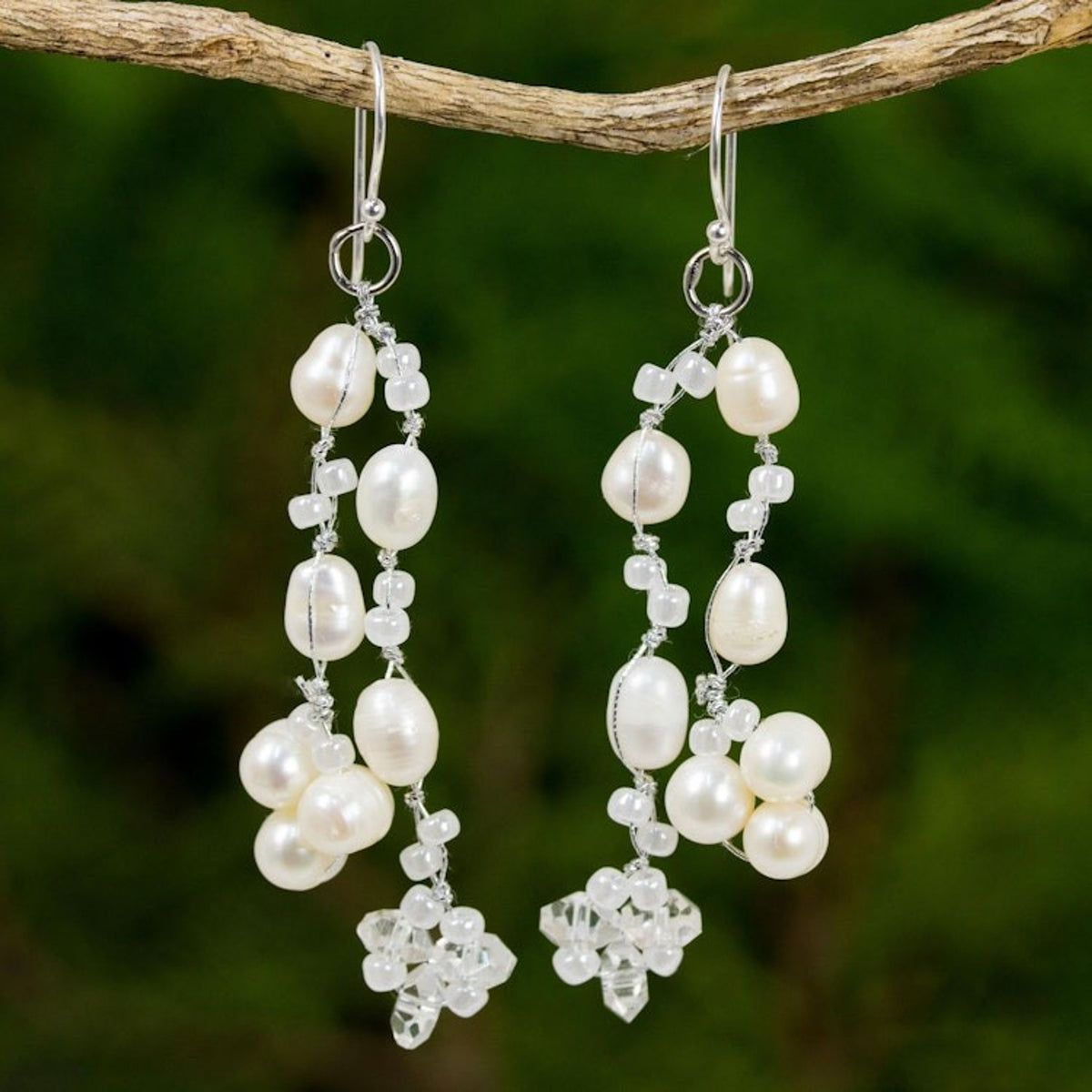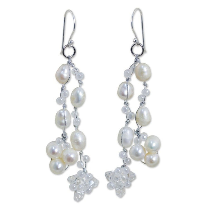 Pearl Earrings from Thailand 'Whisper' These 'Whisper' earrings by Independent Artisans are a beautiful, ethereal design from Thai artisan Nareerat. Luminous pearls, knotted by hand on silken cords, seem to "whisper of moonlight" as they mingle with clustered glass beads. The matte finish of the sterling silver adds a soft, subtle contrast, enhancing the delicate, gossamer quality of the piece. This jewelry is a celebration of skill, heritage, and the determination to keep the art of handmade jewelry alive for future generations.