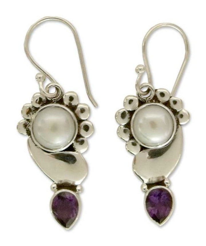 Pearl Earrings with Amethyst and Sterling Silver from India 'Rajasthan Glory'