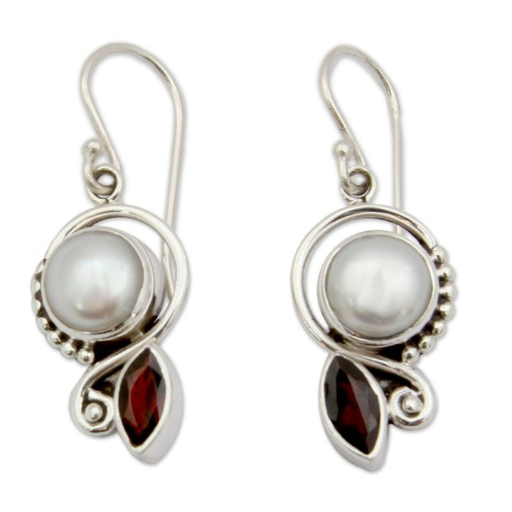 Pearl Garnet Earrings in Sterling Silver Jewelry 'Sublime Romance' These 'Sublime Romance' earrings by Independent Artisans are a stunning celebration of passion and beauty. Crafted by Indian designer Shanker, they combine faceted garnet with radiant ivory pearls. The gems are cradled in intricate sterling silver arabesques, with a combination finish that highlights the contrast between the rich, deep red of the garnet and the luminous glow of the pearls. This piece represents Shanker's artistic vision, his perseverance, and his love for his craft.